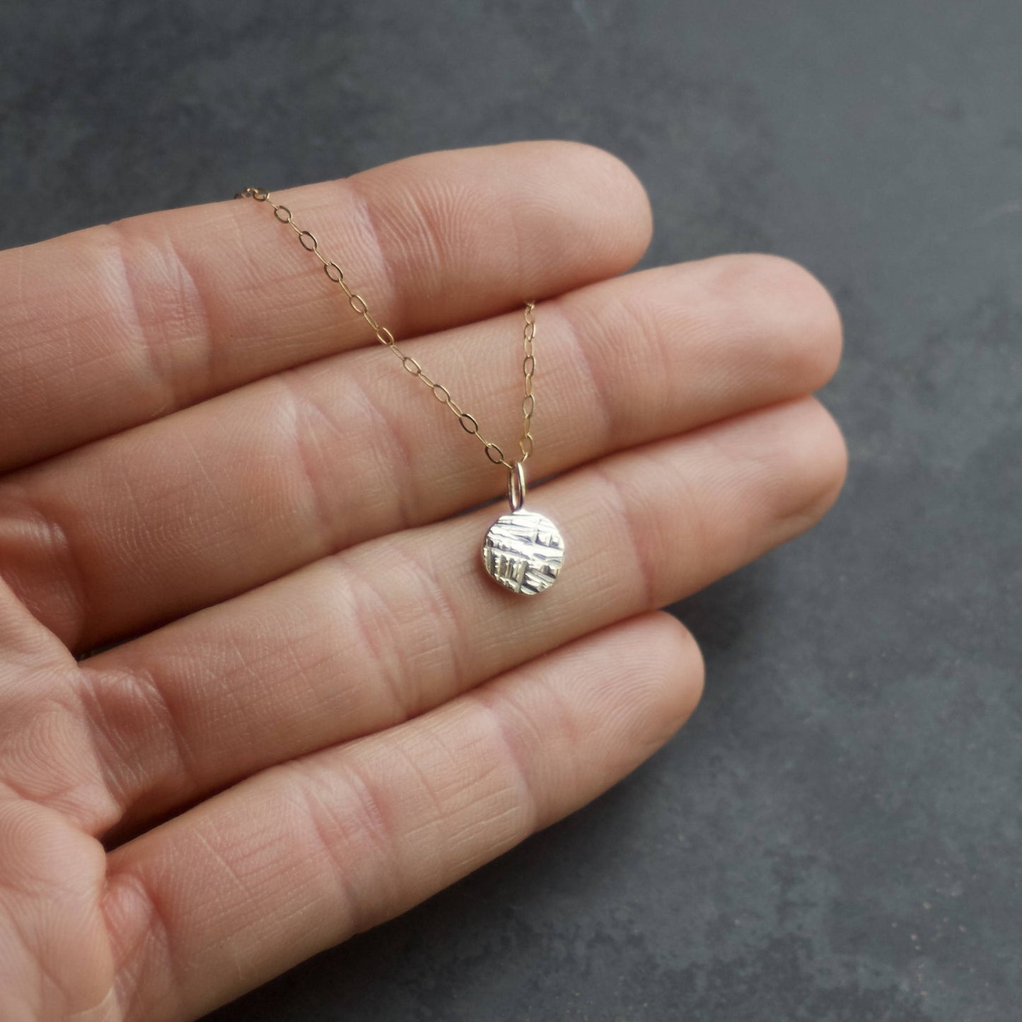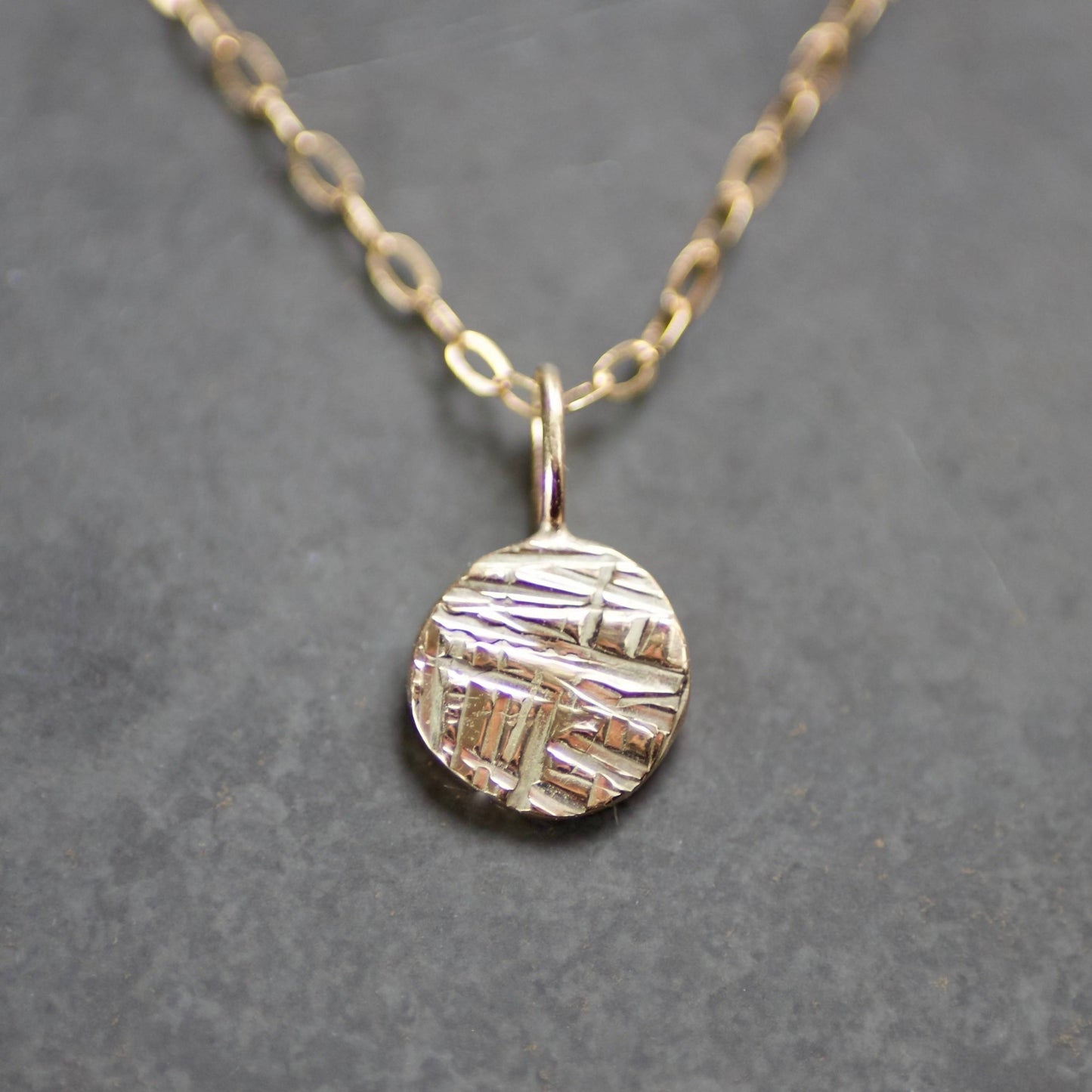 A delicate, handmade necklace, made from solid 9ct gold. The 9ct gold pendant has been formed by melting & smelting down unused 9ct gold from the workshop, into a slightly organic shaped disc, then gently textured with a criss cross effect to give a light texture. Elegant, discreet & fine, perfect for layering with other necklaces.