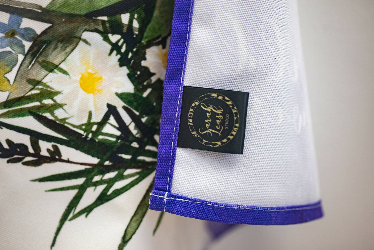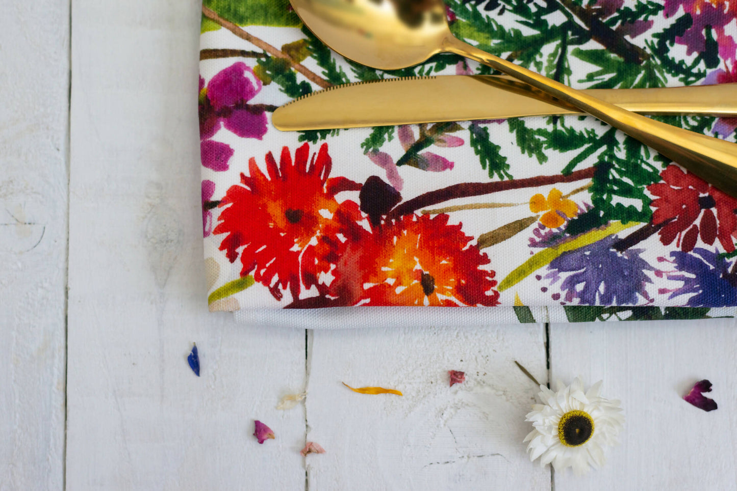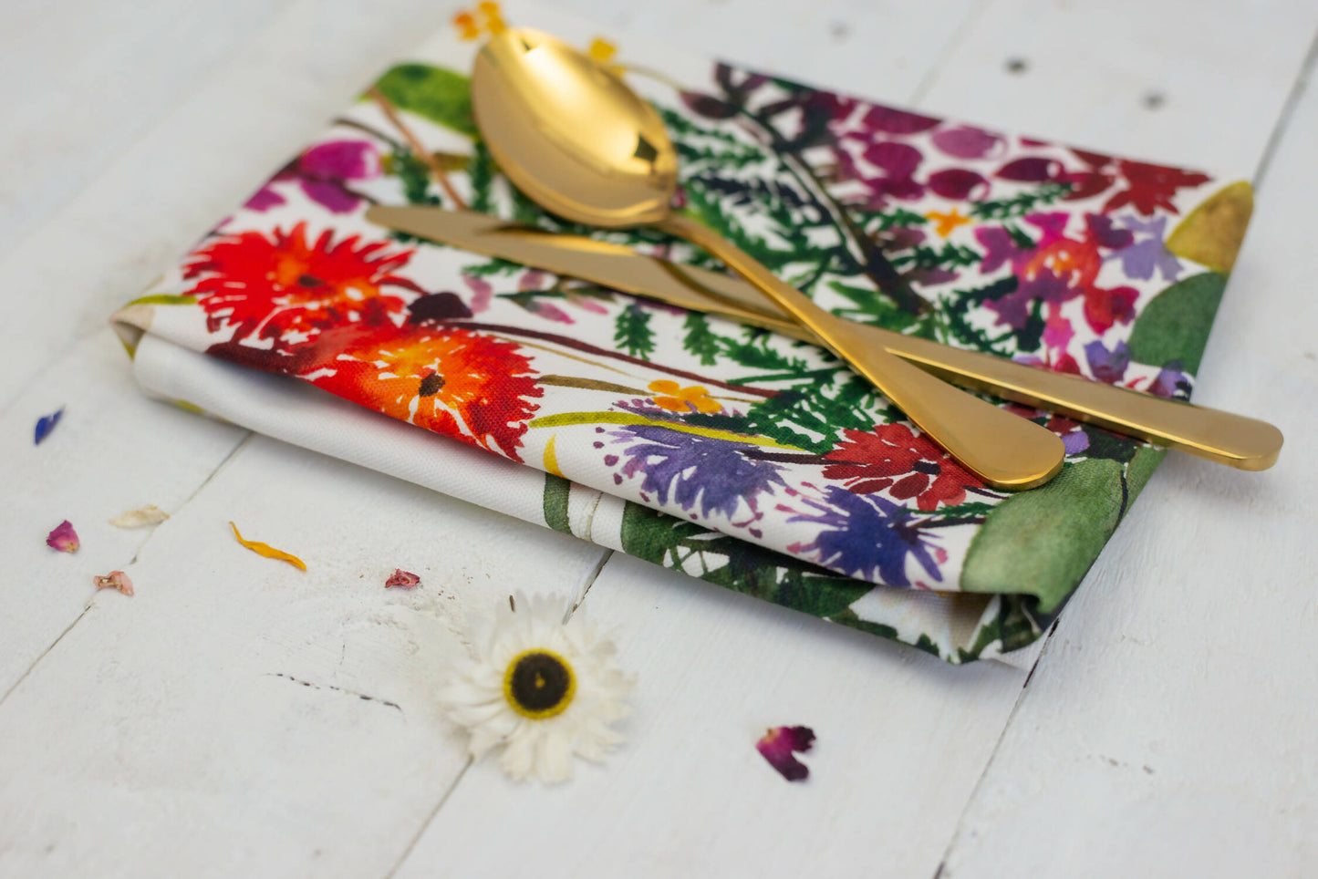 Luxurious cotton tea towel tastefully adorned with a coastal wildflower bouquet