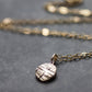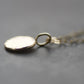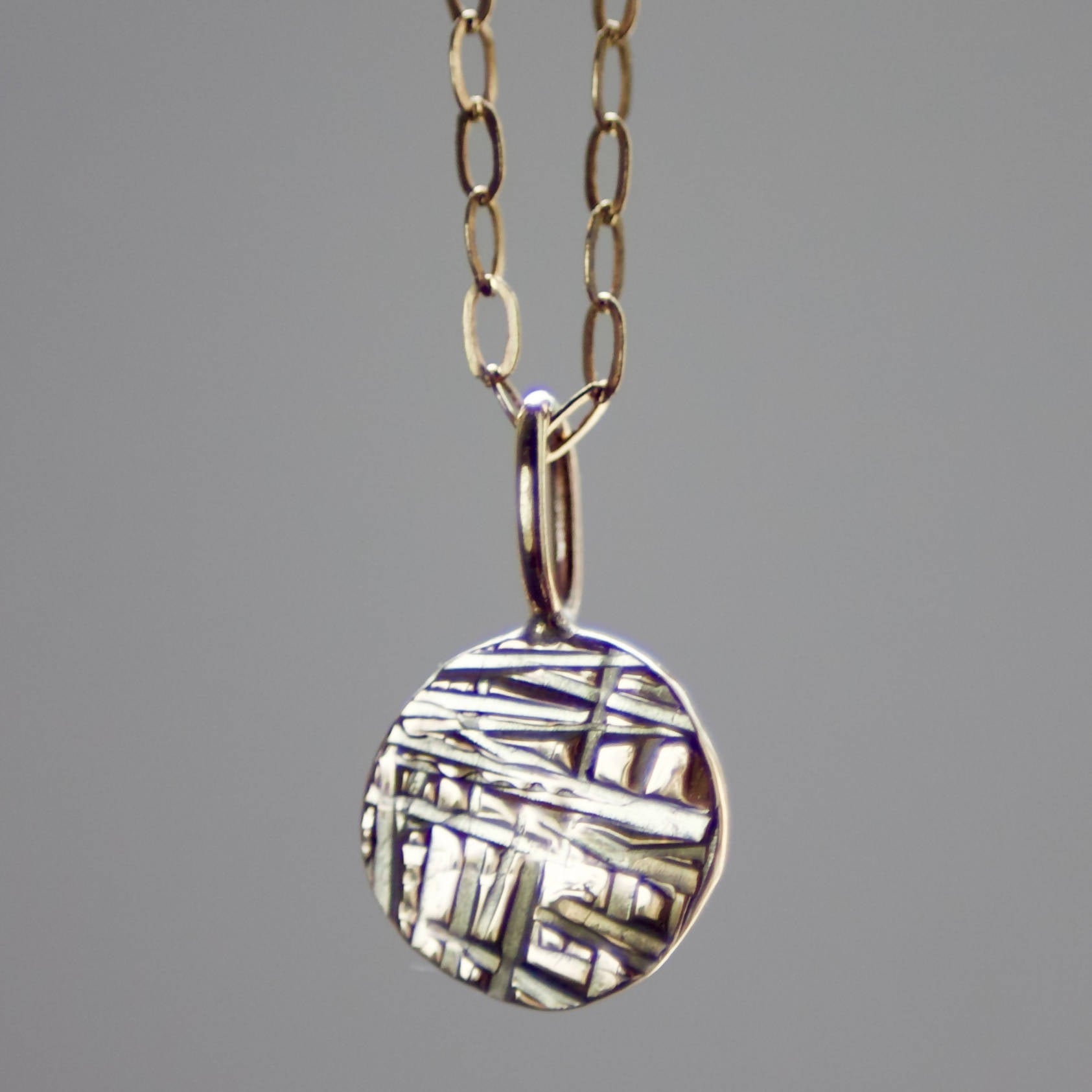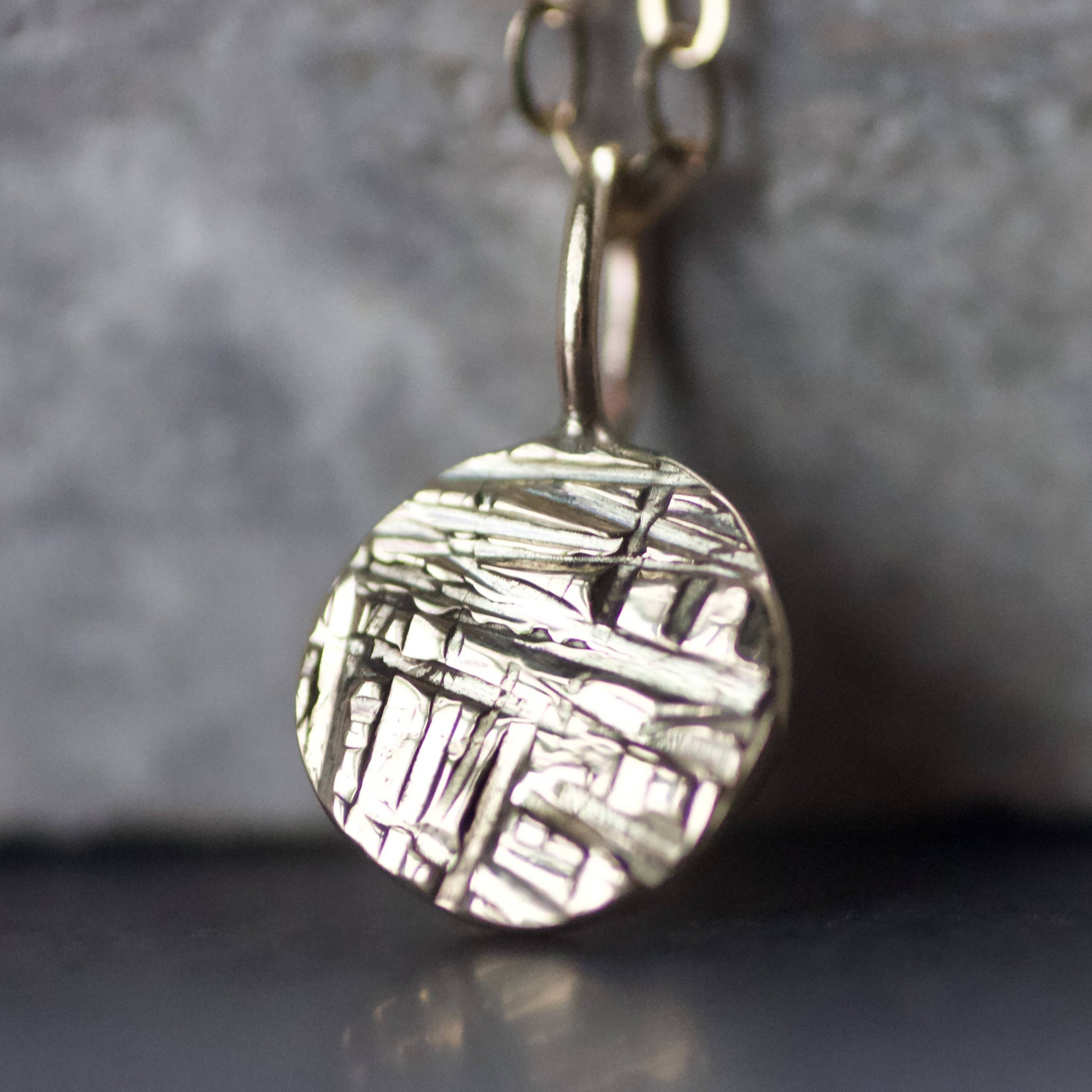 A delicate, handmade necklace, made from solid 9ct gold. The 9ct gold pendant has been formed by melting & smelting down unused 9ct gold from the workshop, into a slightly organic shaped disc, then gently textured with a criss cross effect to give a light texture. Elegant, discreet & fine, perfect for layering with other necklaces.