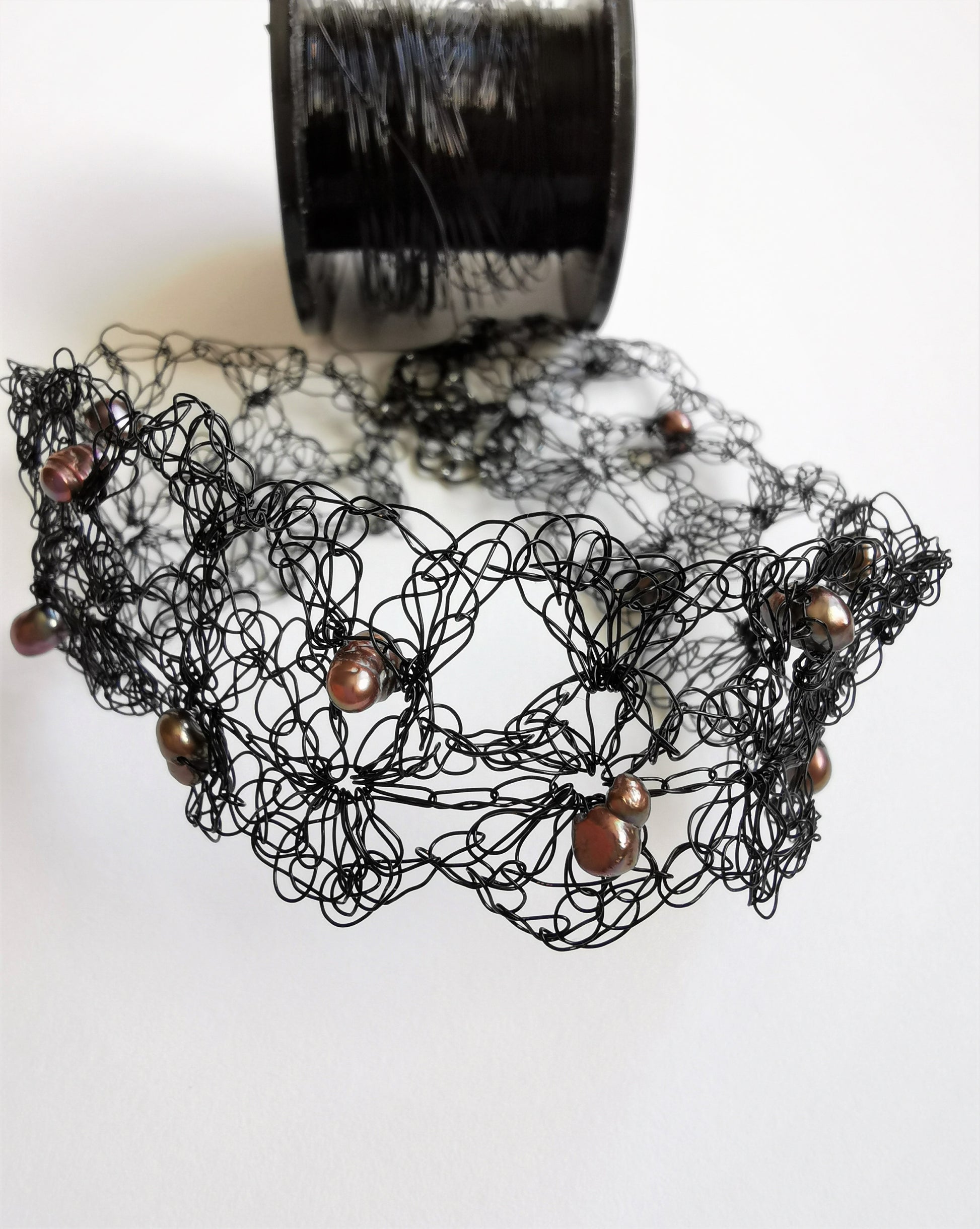 Black, handmade crochet copper wire bracelet in a lace pattern. There are 11 small freshwater pearls in bronze colour throughout the bracelet. It fastens with a lobster clasp in similar colour and also has an extension chain for easy adjustment.