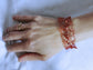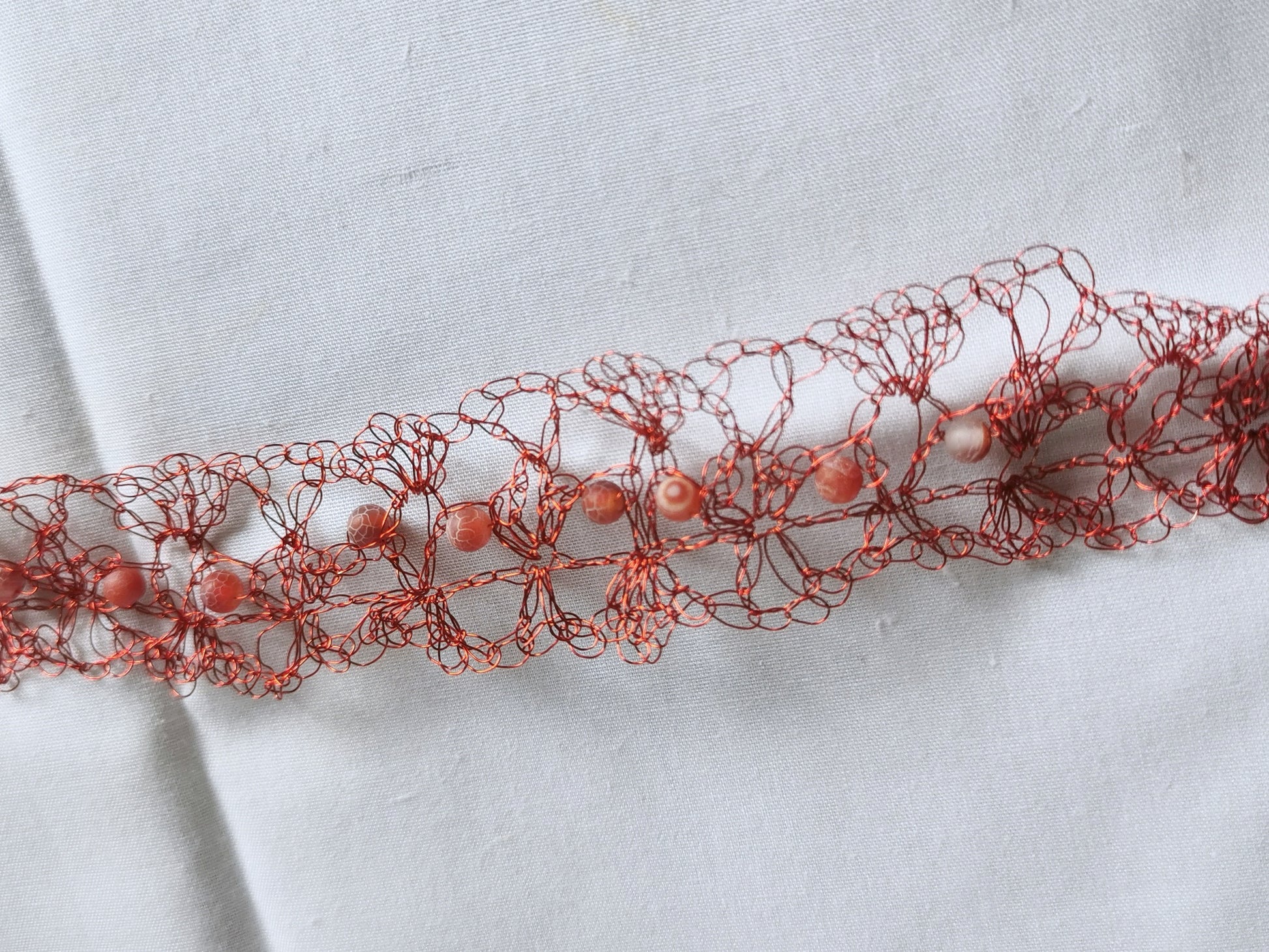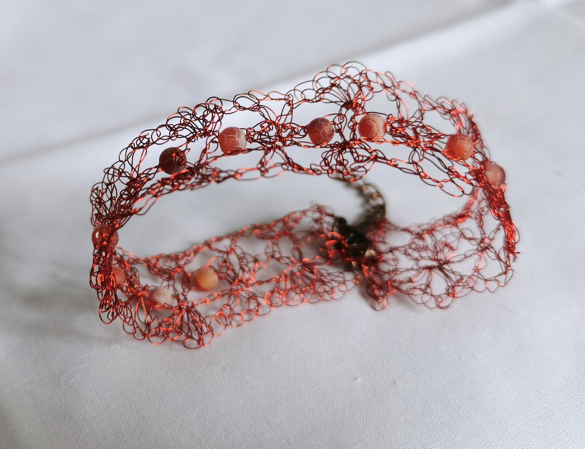 Handmade crochet bracelet in bright red colour using a very fine copper wire and a lace pattern. There are 10 Agate beads in matching colours throughout the bracelet. It fastens with a lobster clasp and has an extension chain for easy adjustment in various sizes.