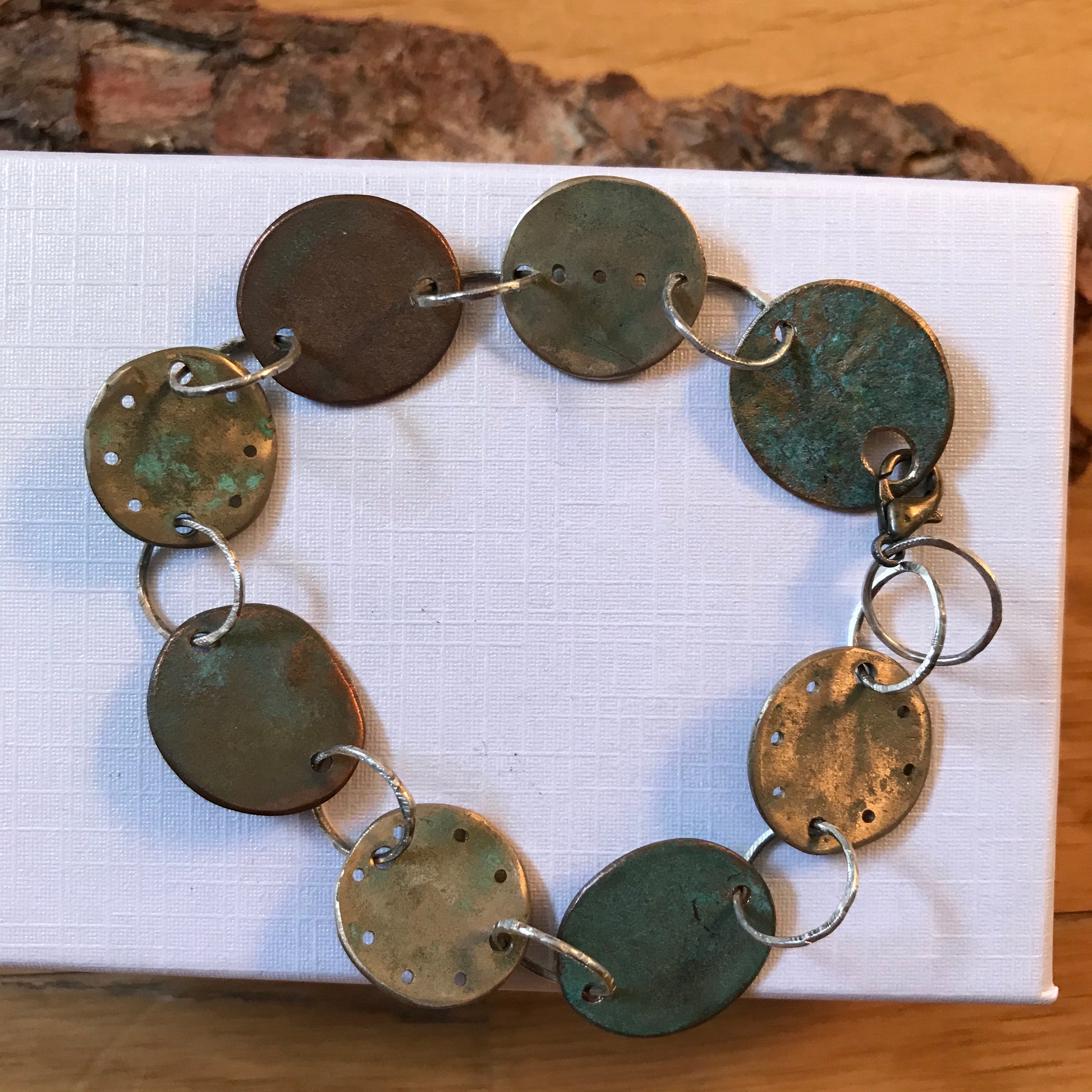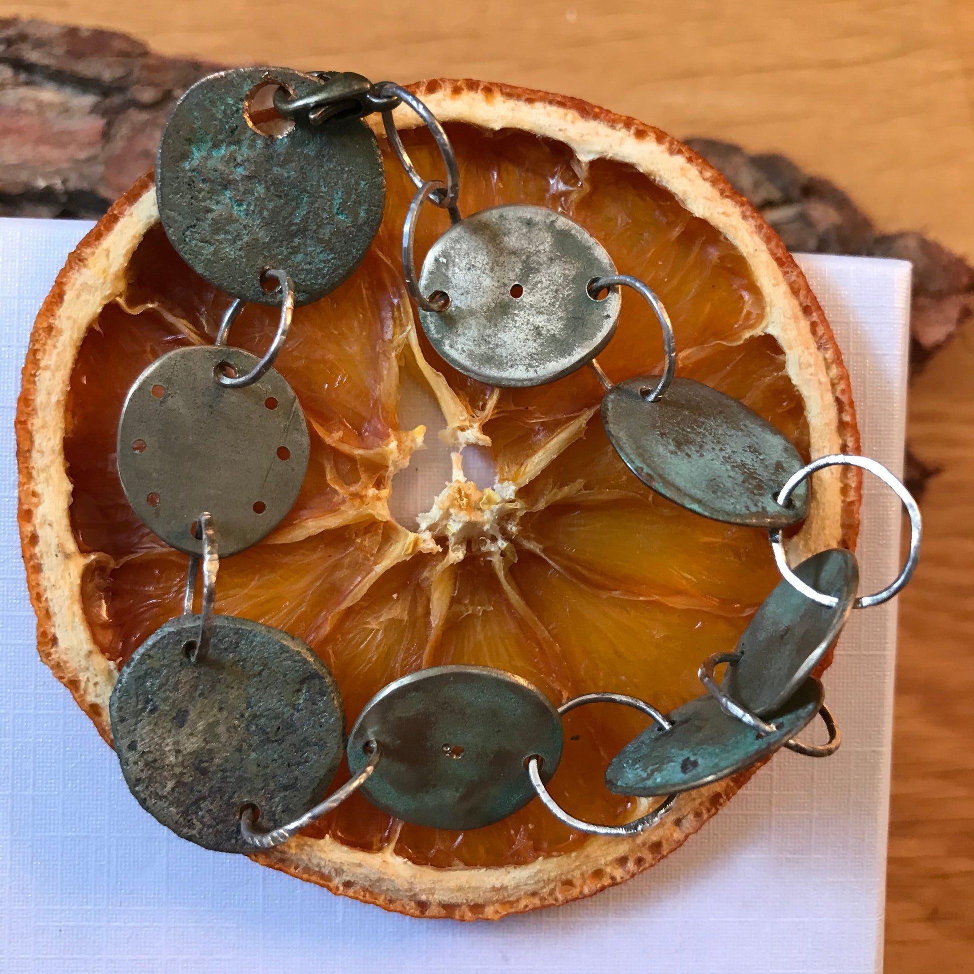 - Sterling silver jump rings, patinated bronze discs, approx.200 mm long, approx. disc size 16 mm diameter