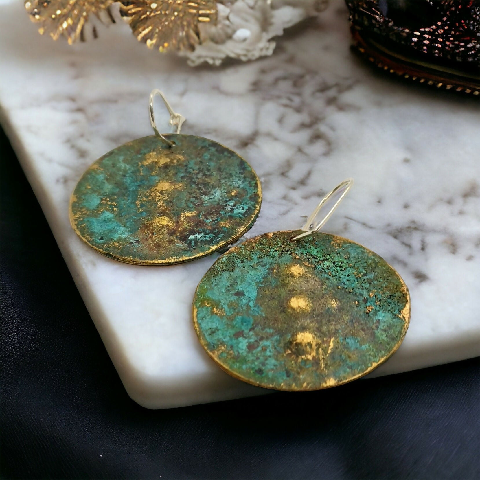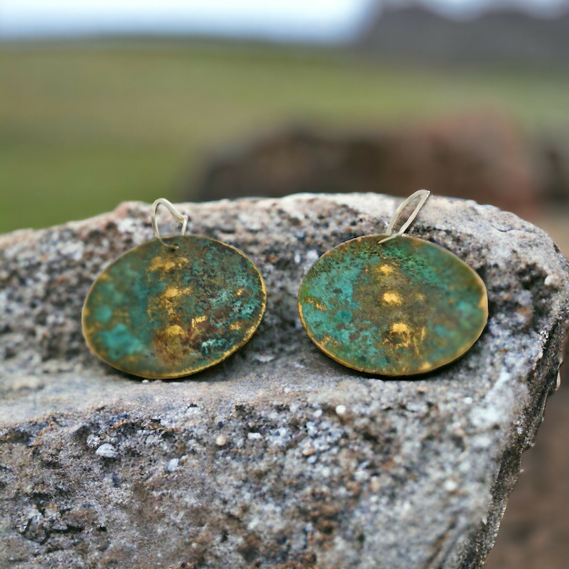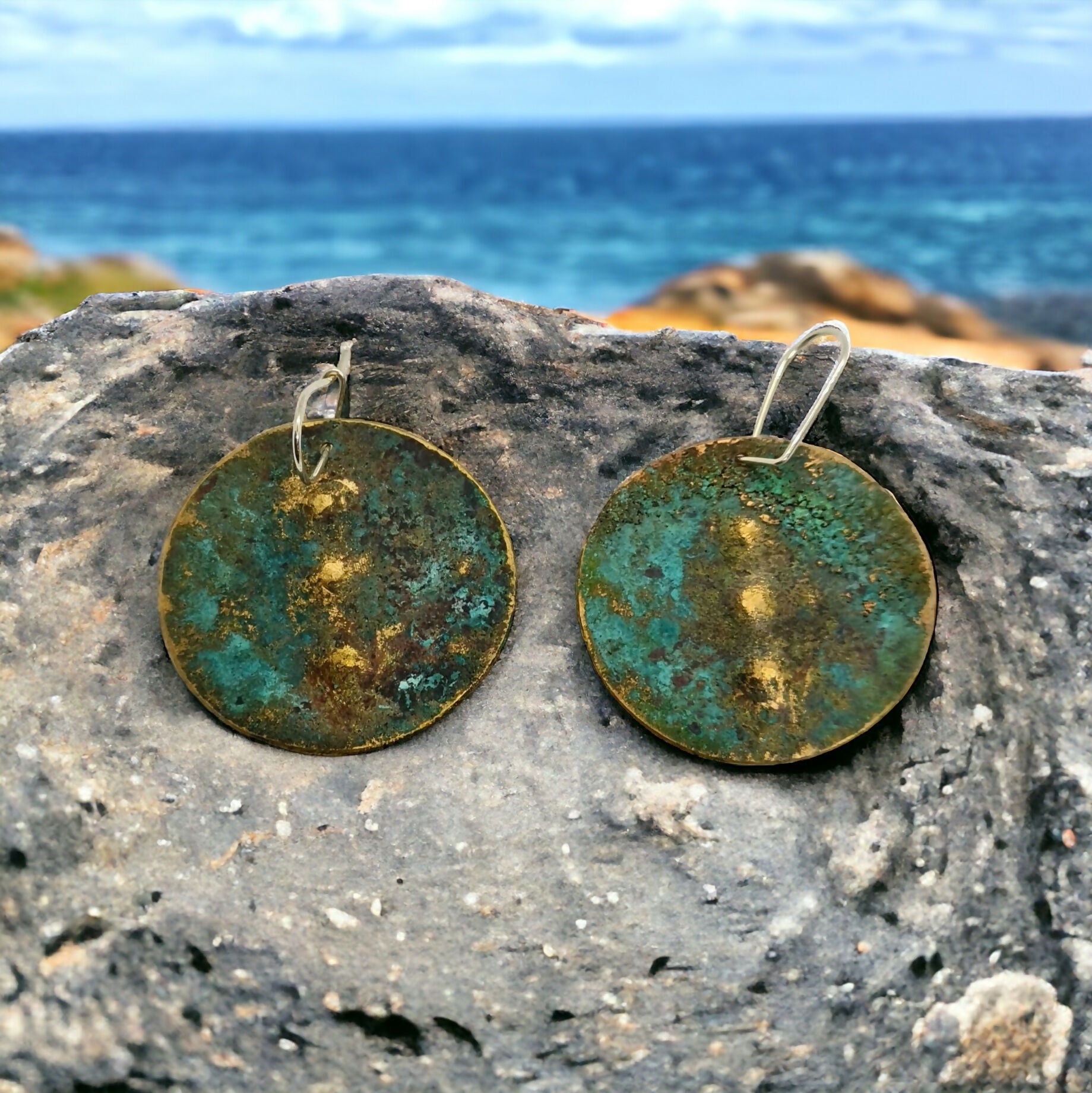 - Found Beneath Large Earrings – sterling silver hooks and patinated bronze, discs are approx. 39 mm, earring drop (whole item) 58 mm