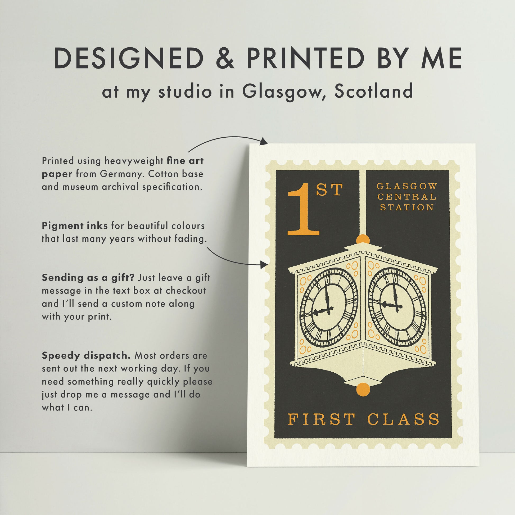 This is a Giclée print made using specialist archival pigment inks on museum grade 300gsm cotton rag paper for a deluxe feel, excellent depth of colour, longevity and stability.
