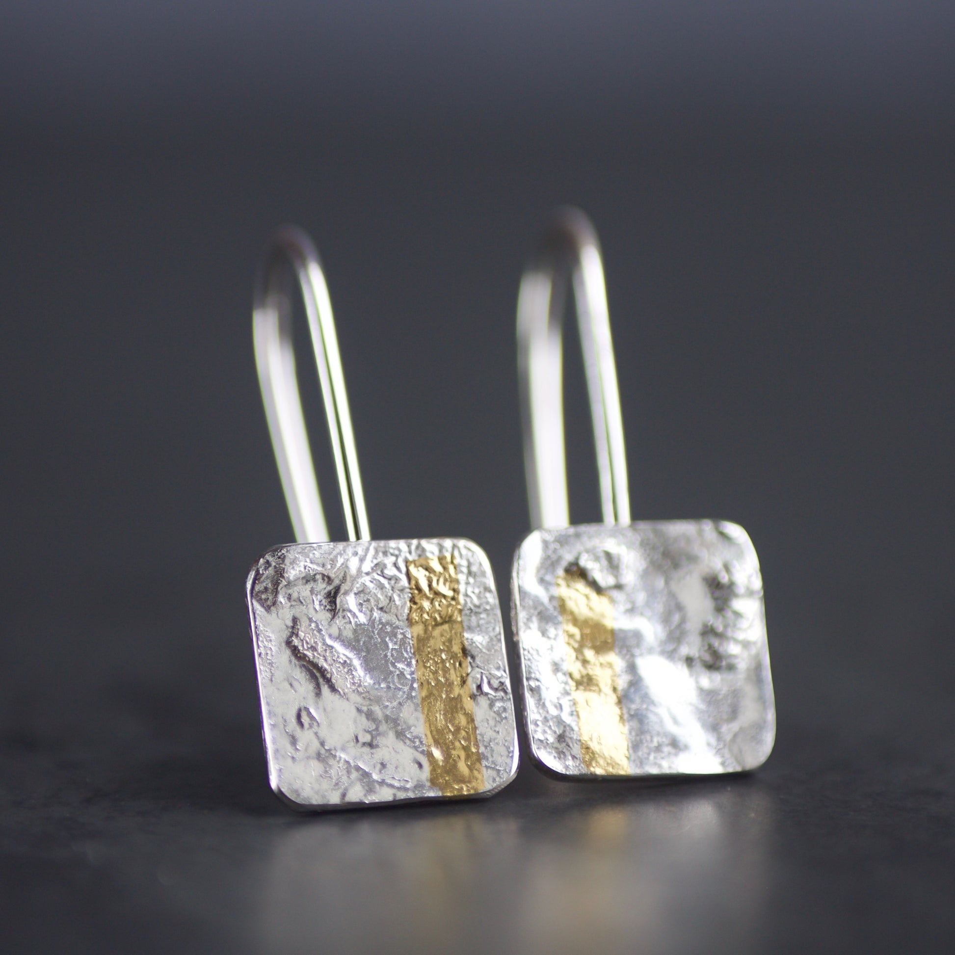 The oxidised versions earrings are then submerged in an oxidising solution which darkens the silver, (these earrings have taken on a lovely warm tone) but leaves the gold untouched, to increase the contrast between the two. The oxidising will very slowly reduce with wear to give a lovely antique look. The silver can be treated again if a darker colour is desired.
