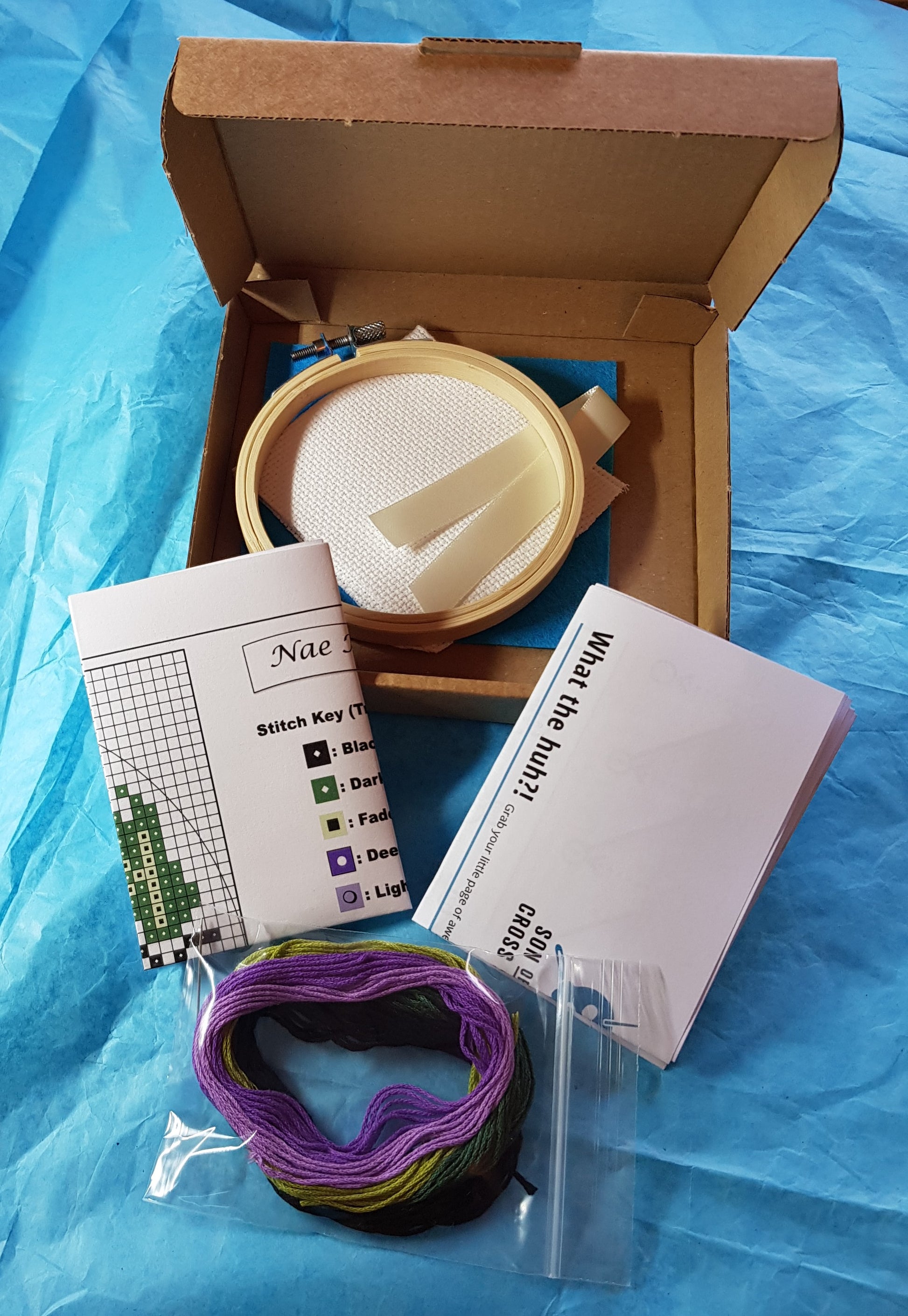 A modern cross stitch kit, which includes everything you need to make an awesome cross stitch piece!
