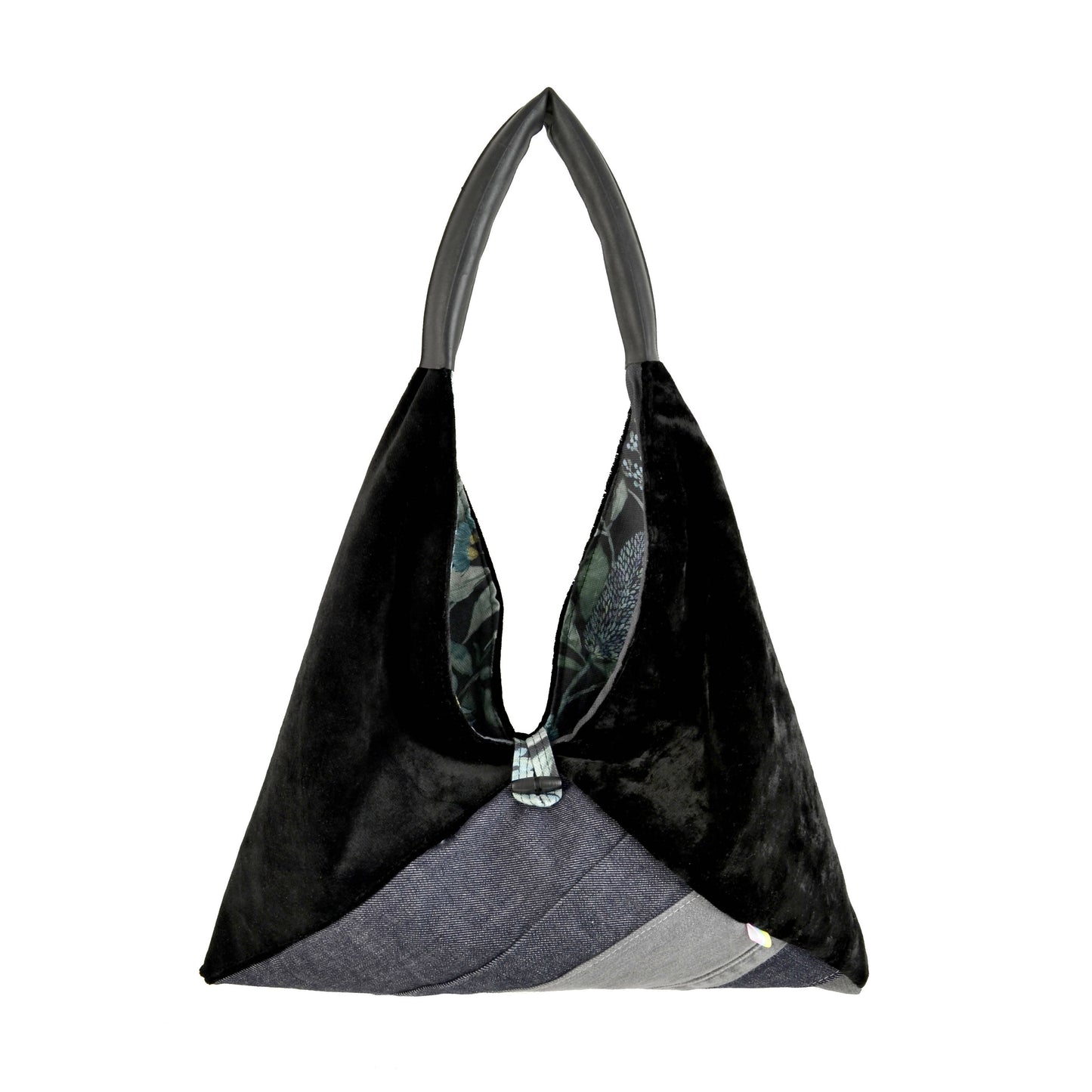 The Japanese inspired, ORIGAMI bag is uniquely created from denim jeans and velvet curtains.