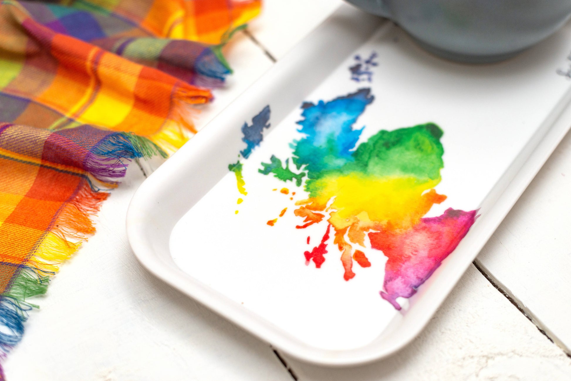 The Scotland Map design is a signature Sarah Leask Studio design which has been painted by hand using watercolours in a rainbow colour-way. The illustration was then scanned in to the computer and cleaned up ready for print. The tray shows off a small section of the original artwork, zoomed in to highlight the details.
