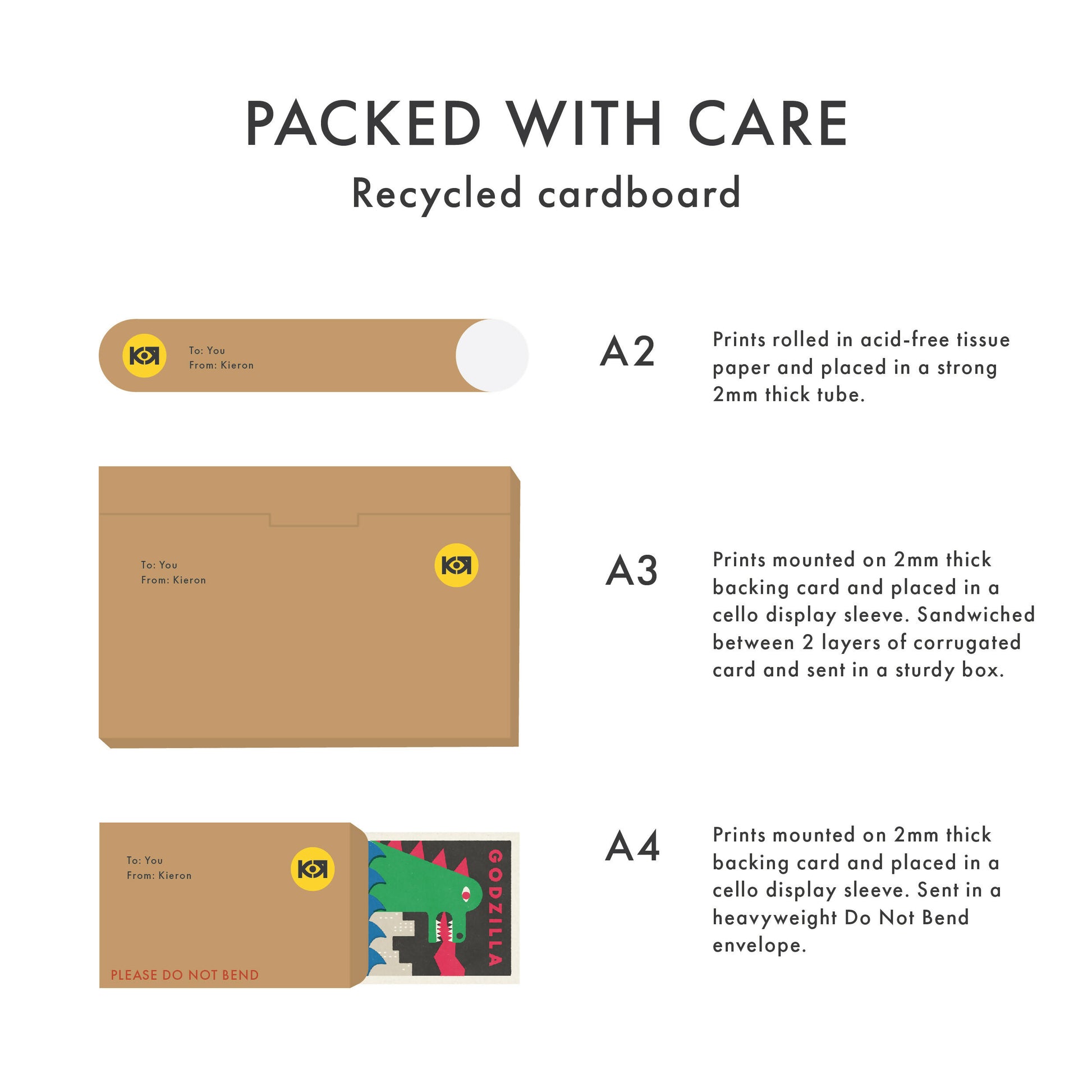 A4 and A3 prints come packaged with strong recycled reinforced backing card and covered in a protective sleeve. Ideal if you're buying as a gift. A2 Prints come rolled in a strong cardboard tube.