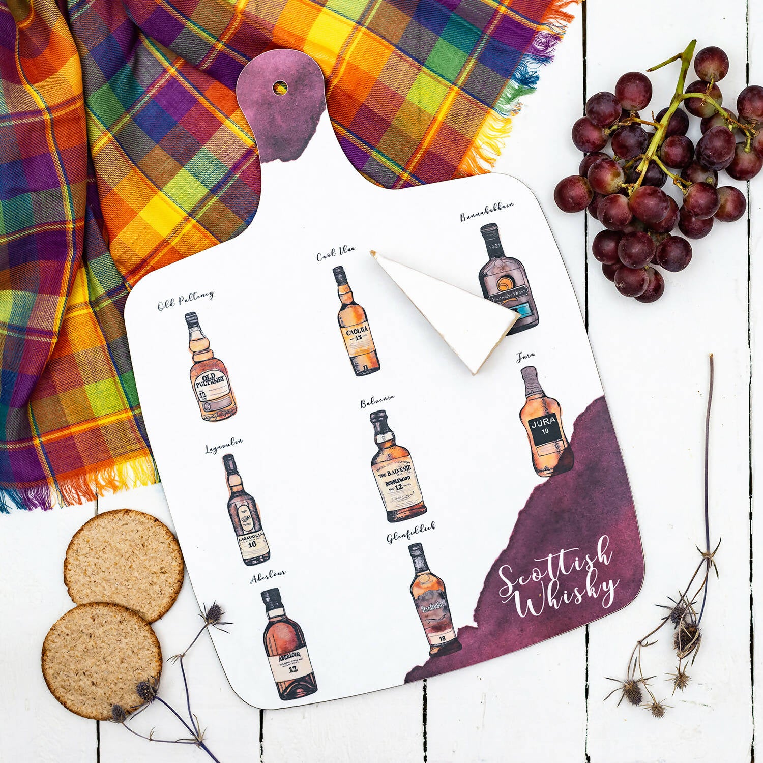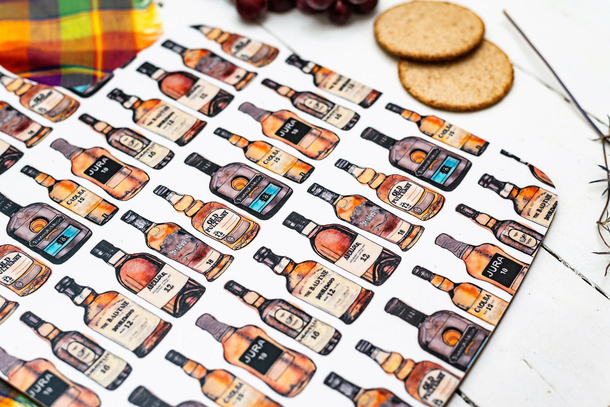 The board has been printed on both sides. The first side features the whisky bottles laid out and labelled, and the second side features the repeat pattern design.