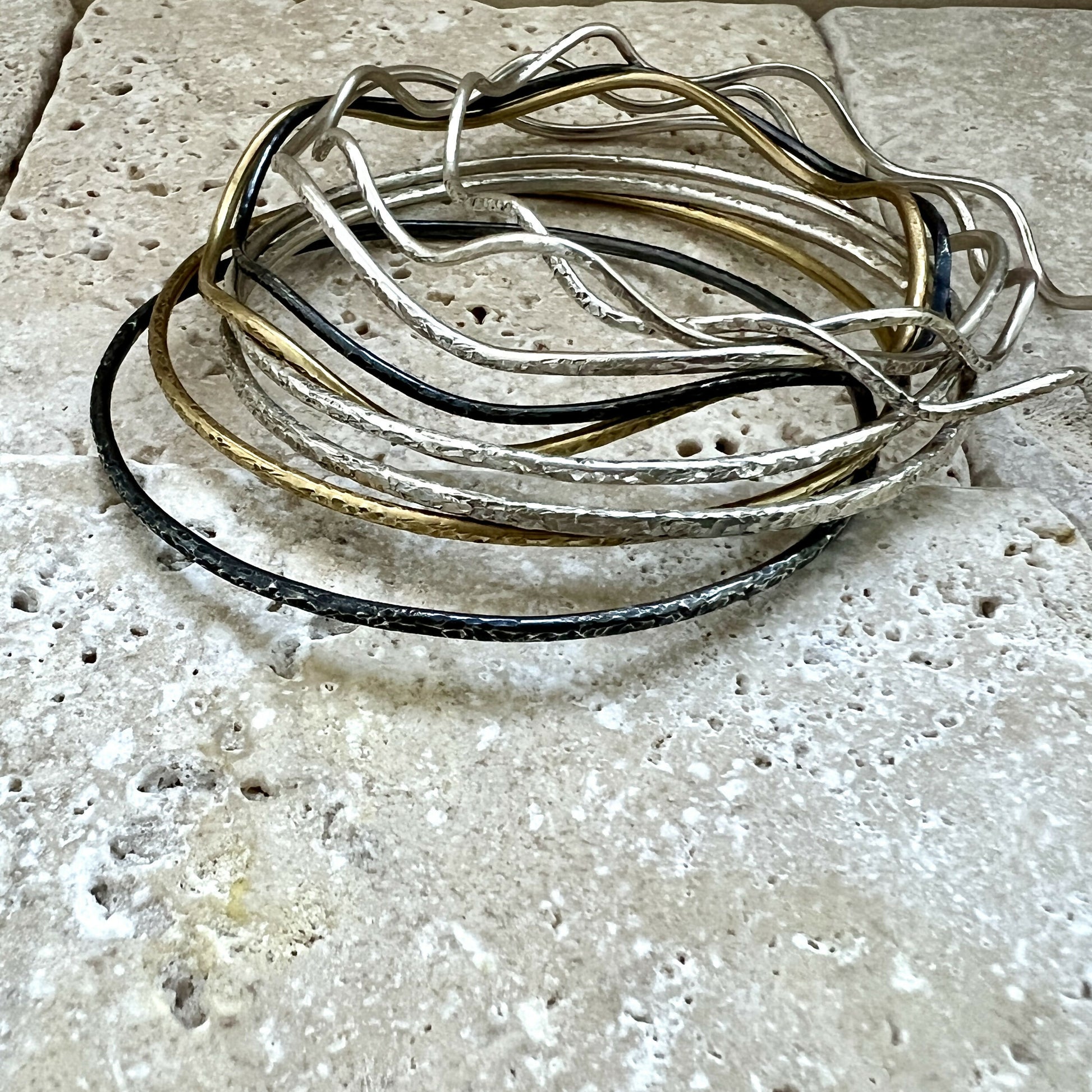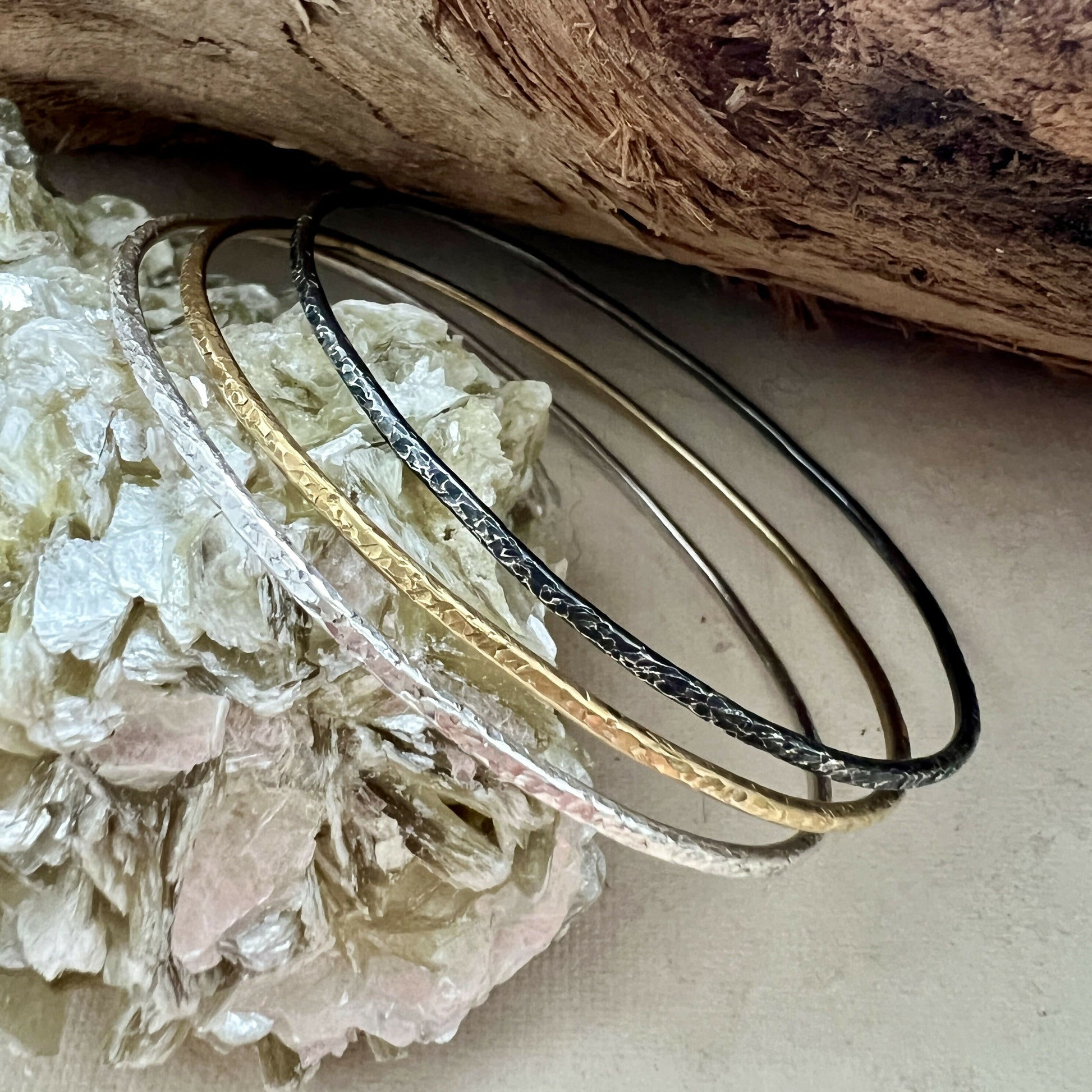 Set of 3 sterling silver textured bracelets. Silver, dark silver and 24 ct gold plated sterling silver.