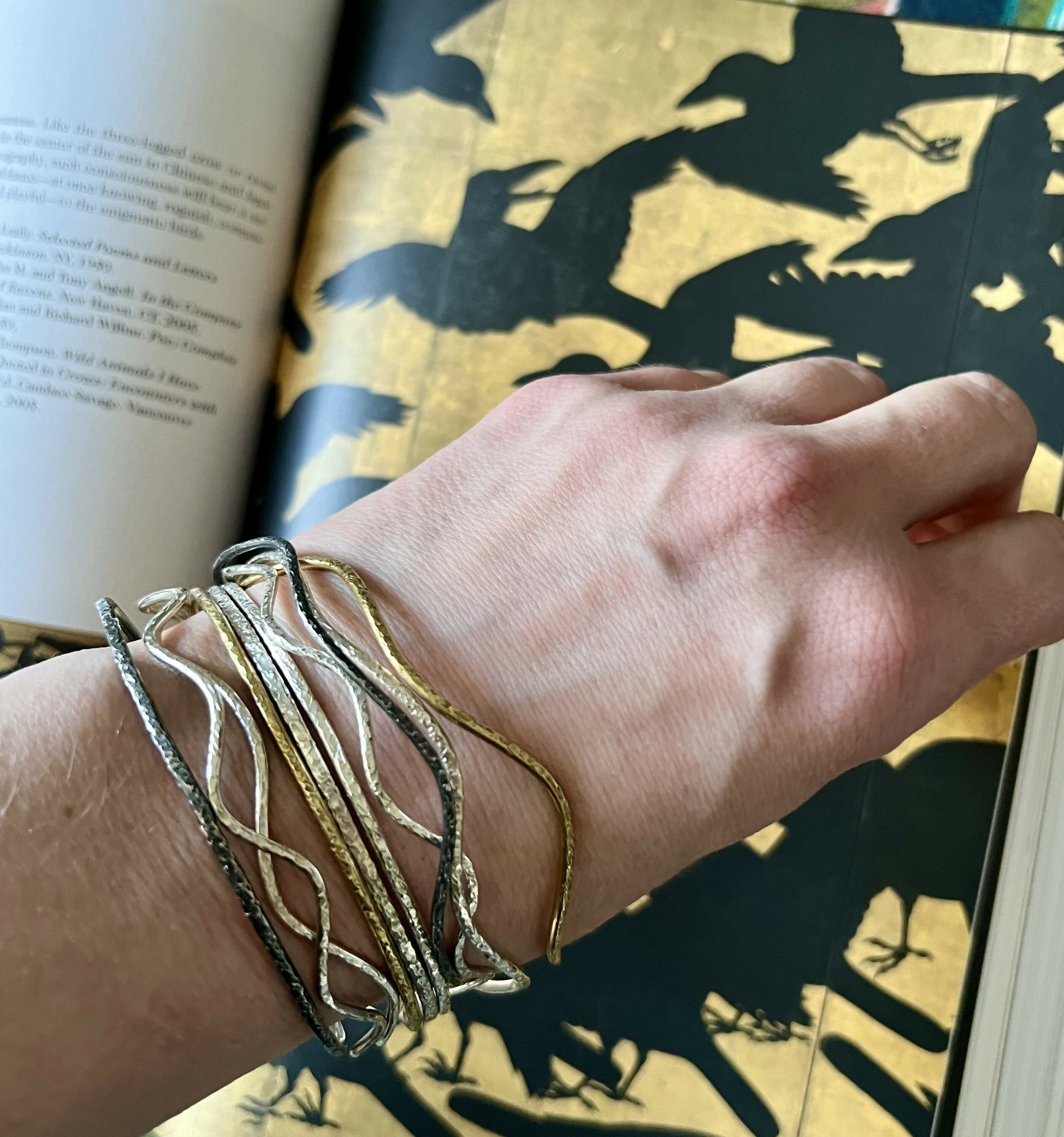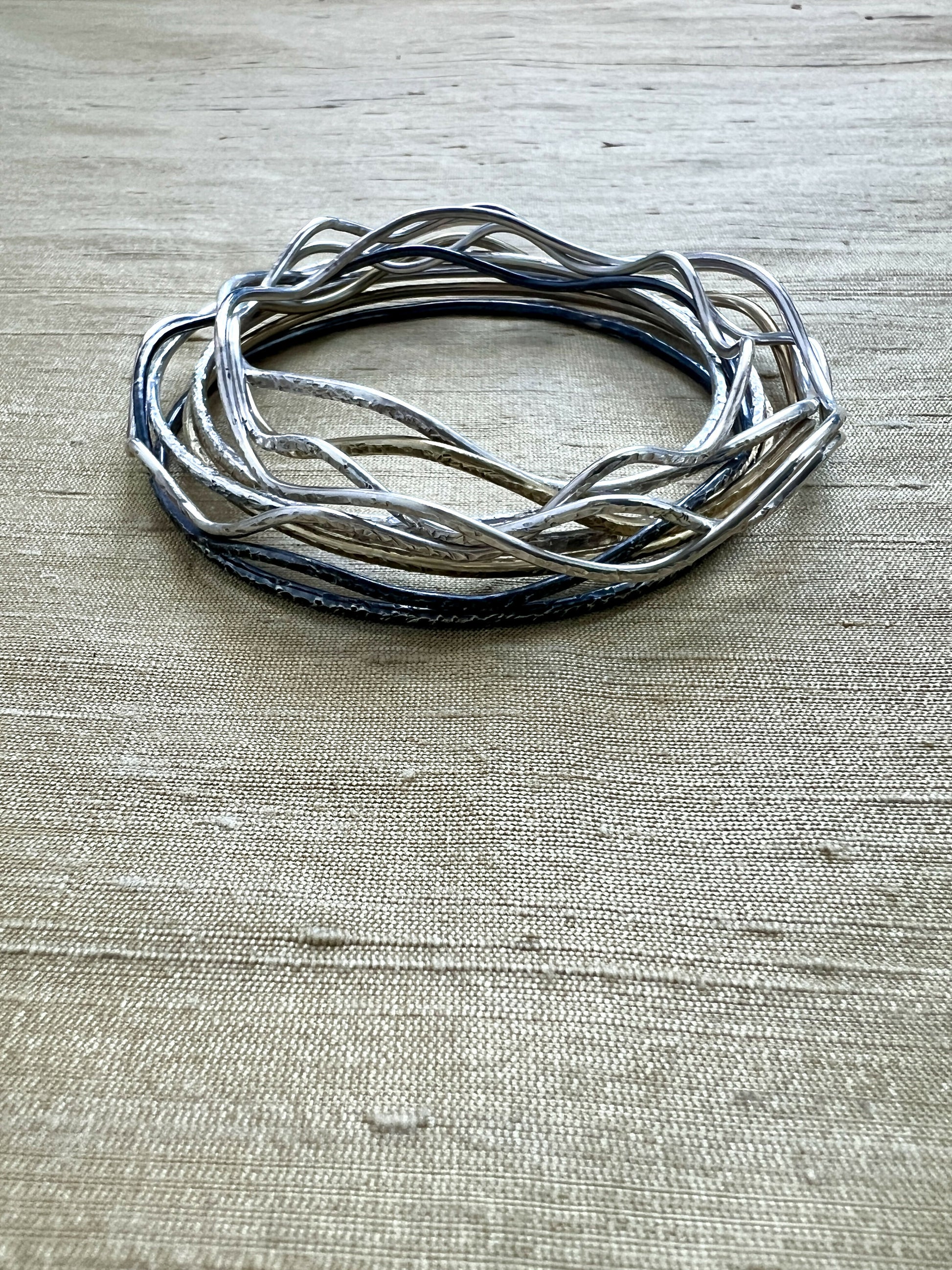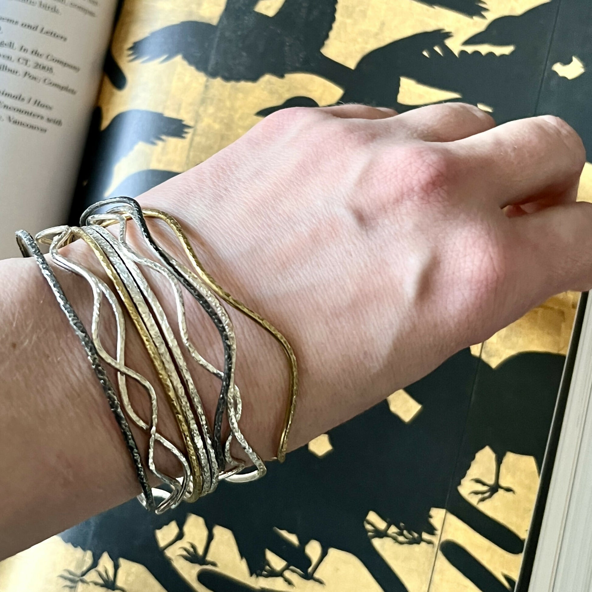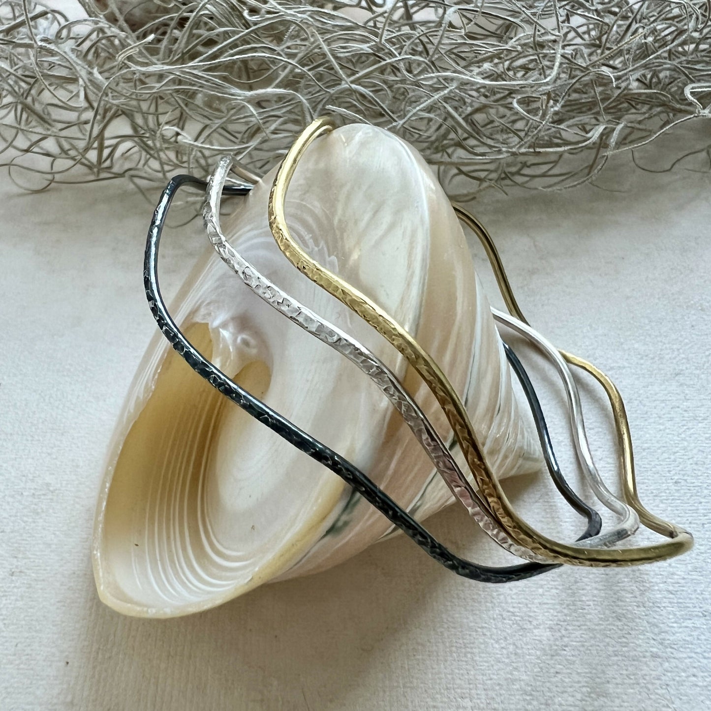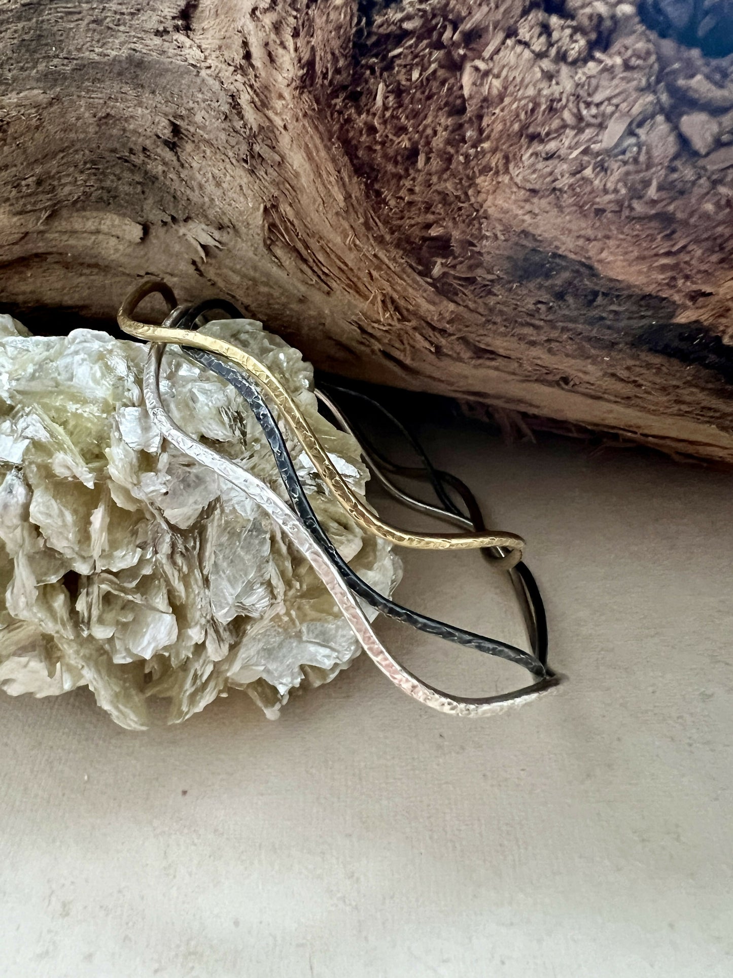Set of 3 sterling silver textured bracelets. Silver, dark silver and 24 ct gold plated sterling silver.