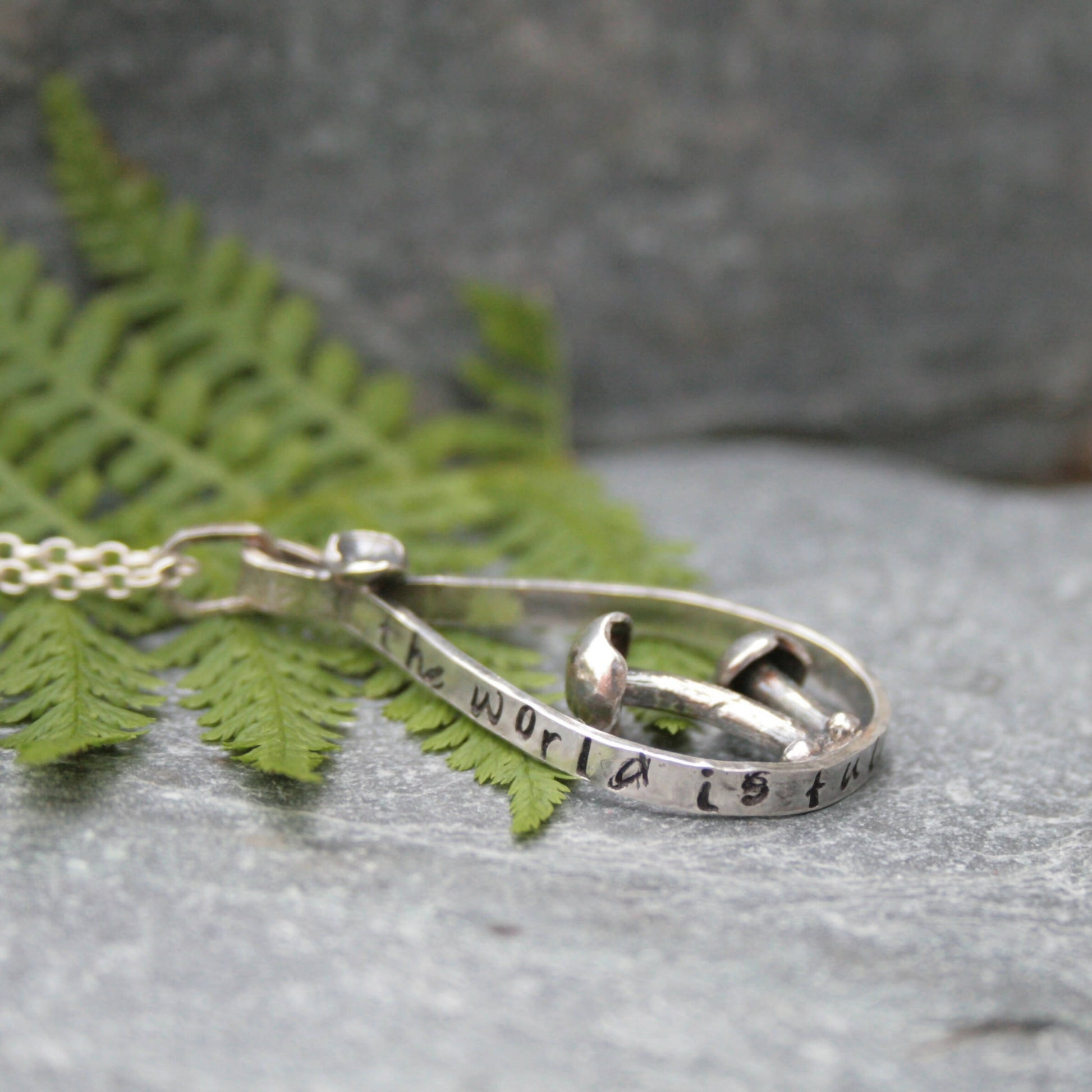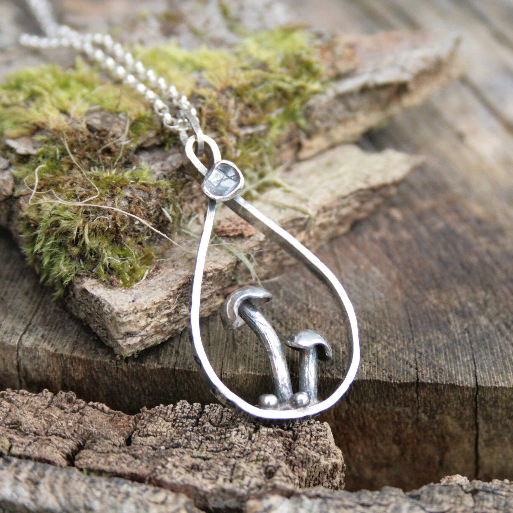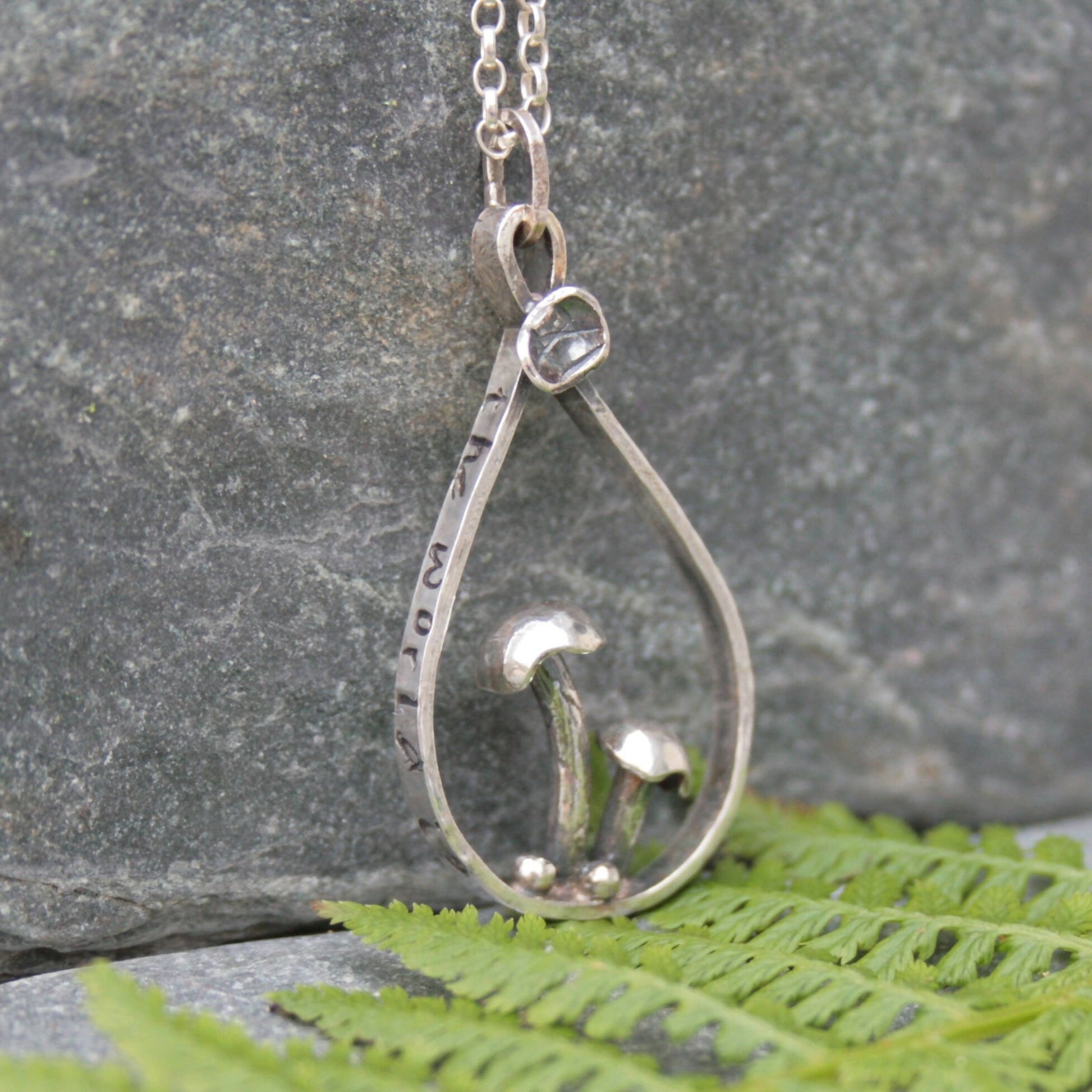 I have created it from recycled sterling silver and there are two little handmade toadstools soldered to the bottom of a teardrop shape of silver.