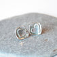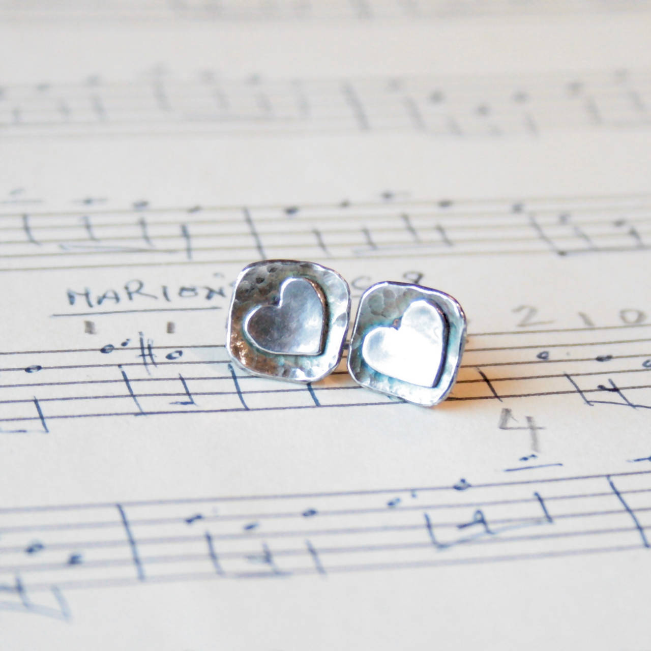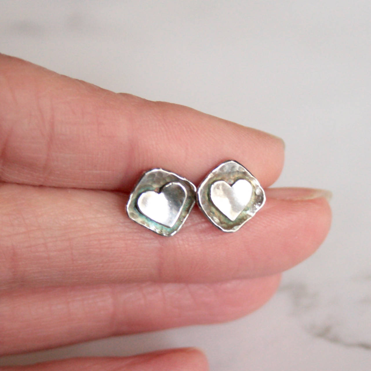 These sterling silver stud earrings consist of a silver heart sitting inside a silver square. The square is textured and gently domed and the surface of the earrings has been darkened with a patina to enhance the detail.