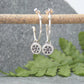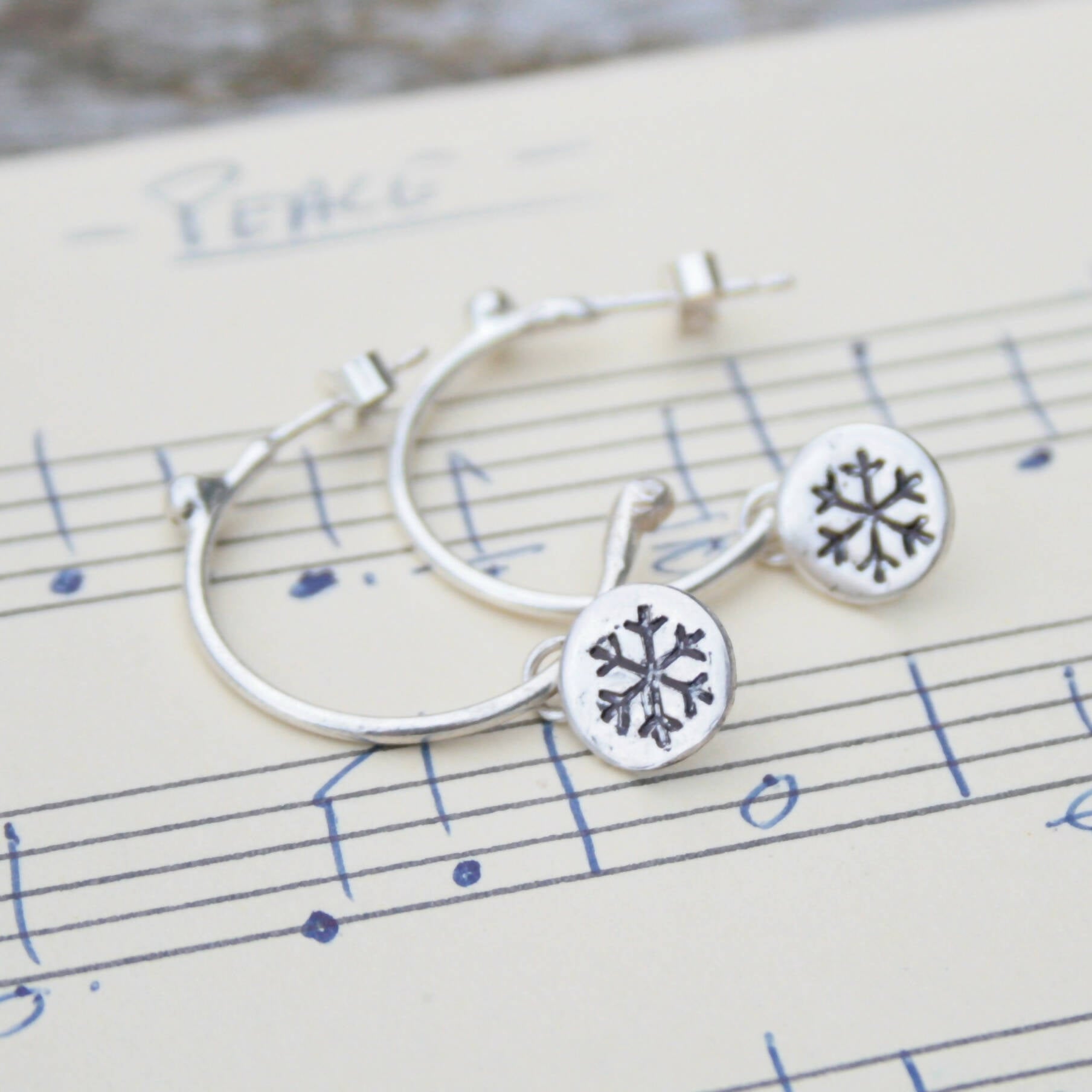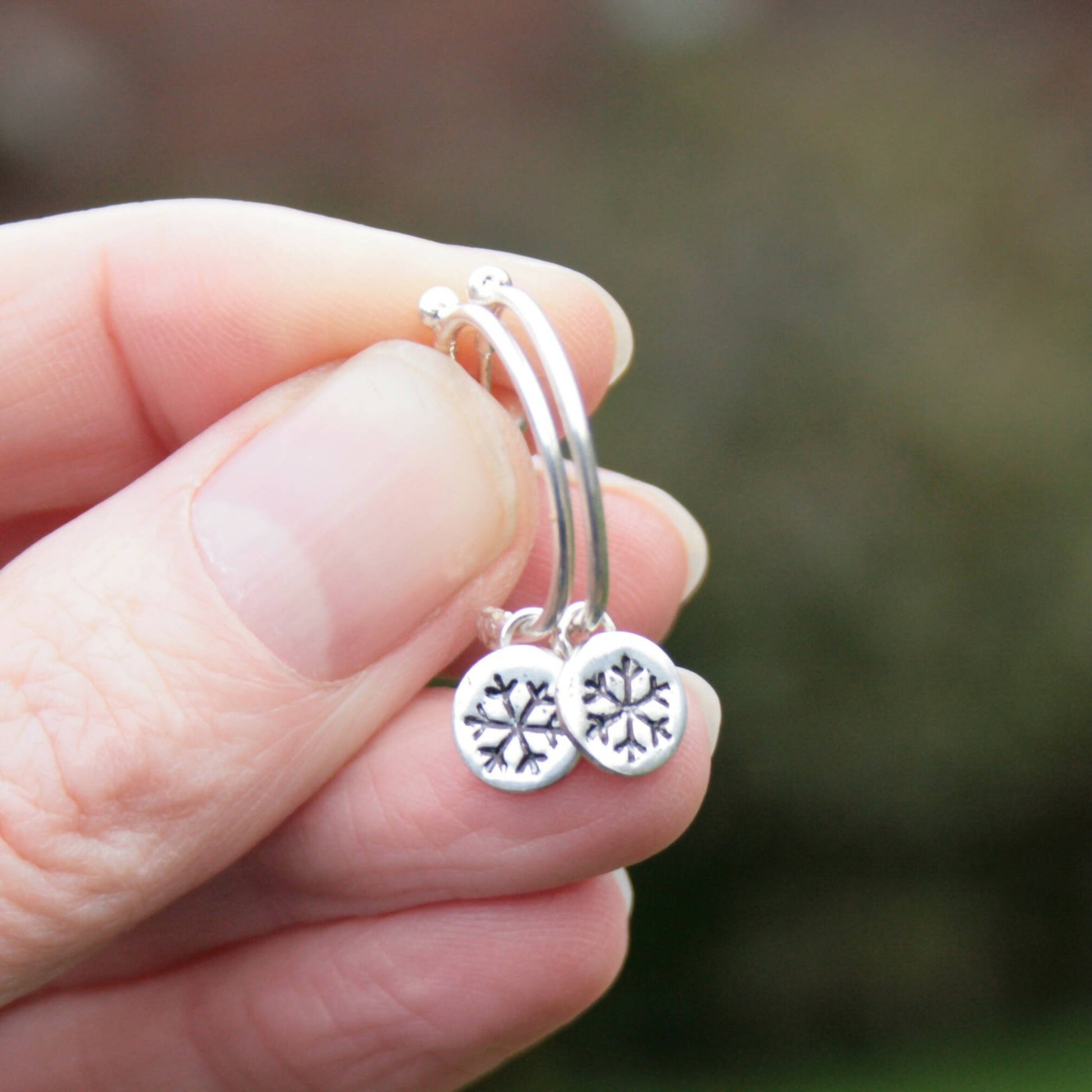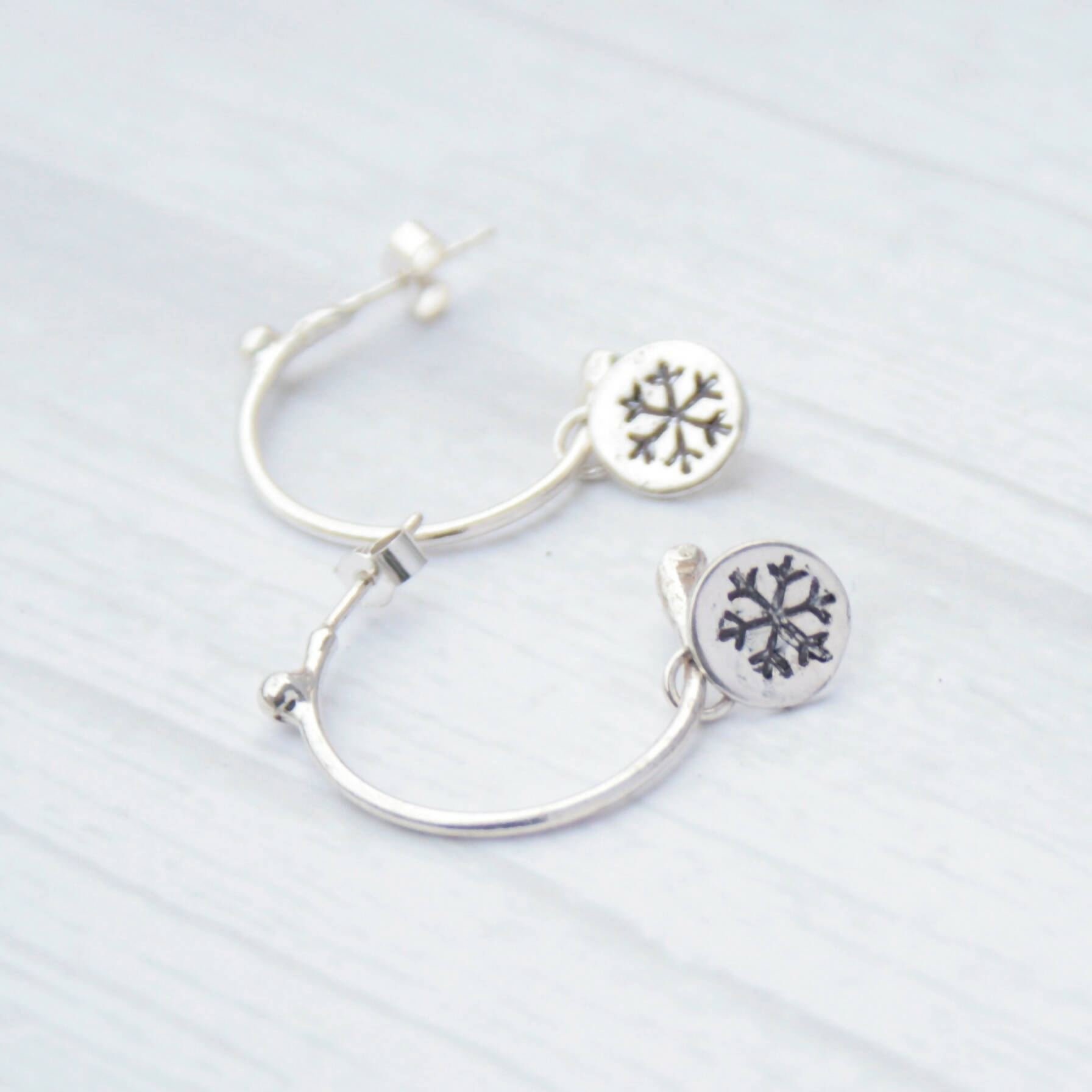They consist of a sterling silver hoop with a snowflake charm hanging from it. The charm is free to move along the earring but will not fall off due to a small granulation ball soldered to the end.