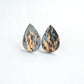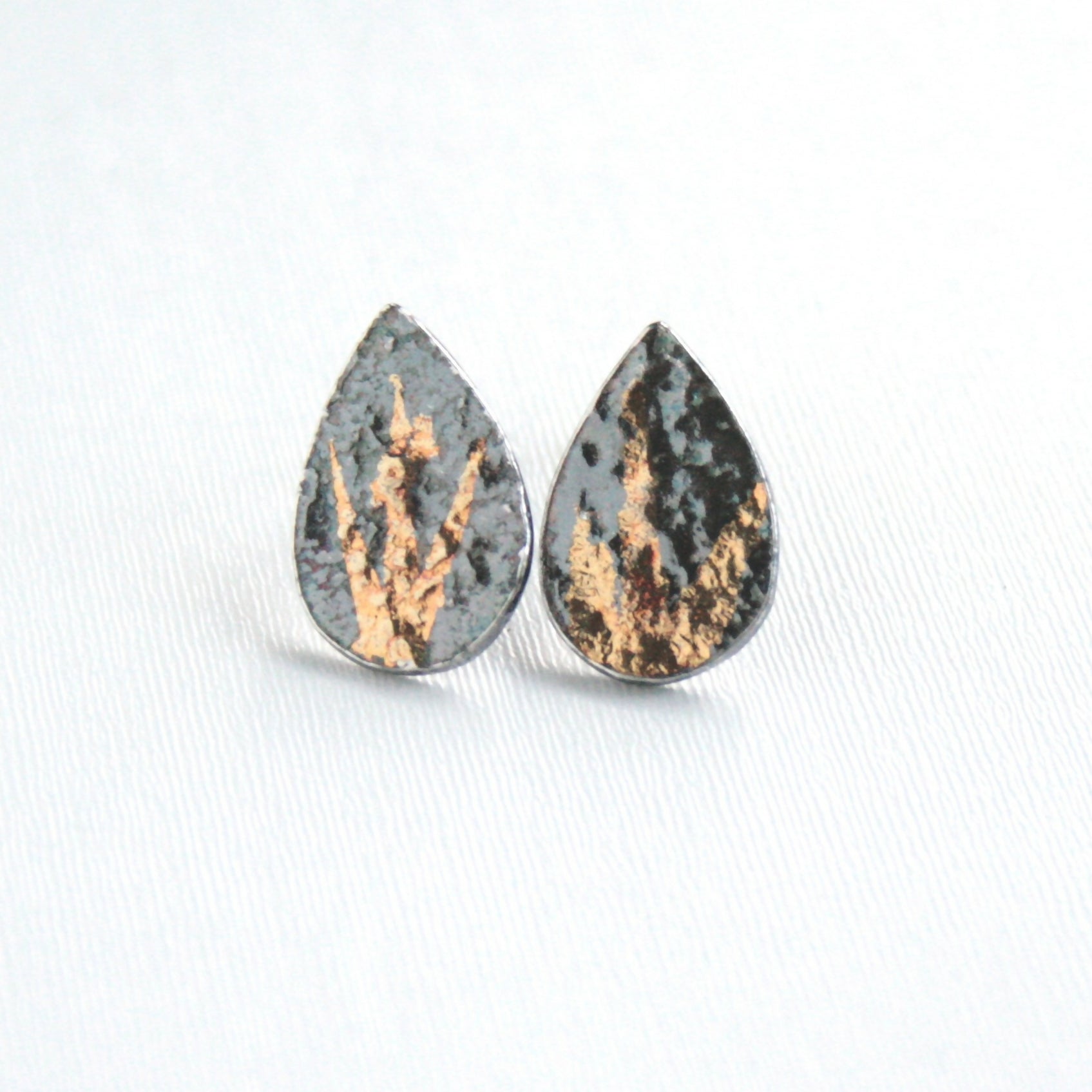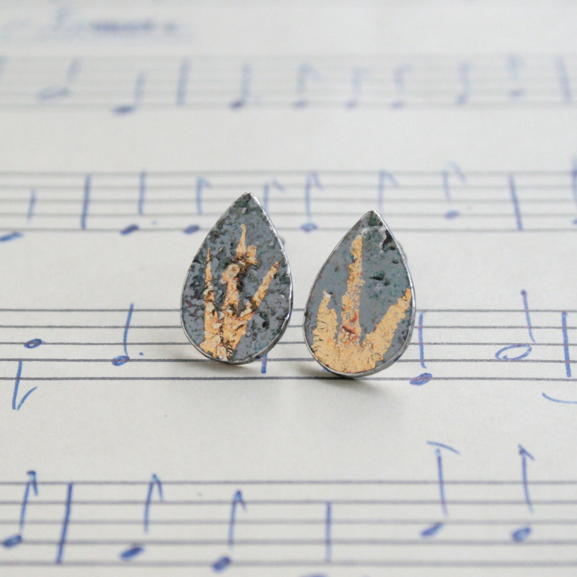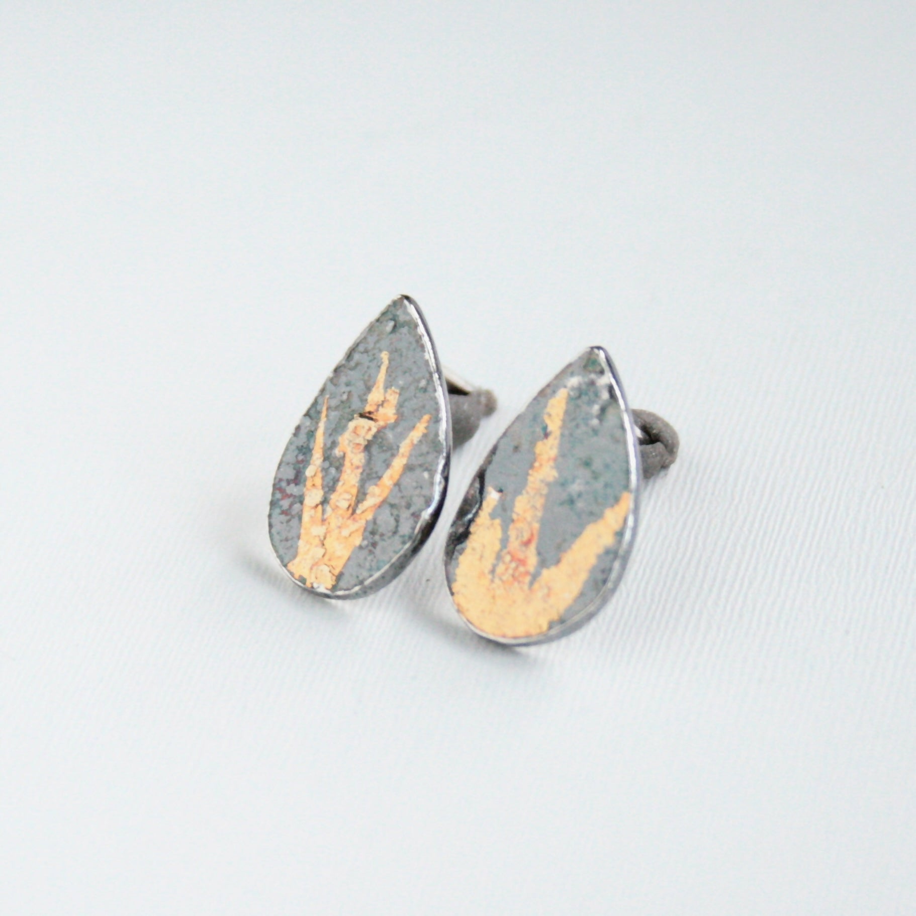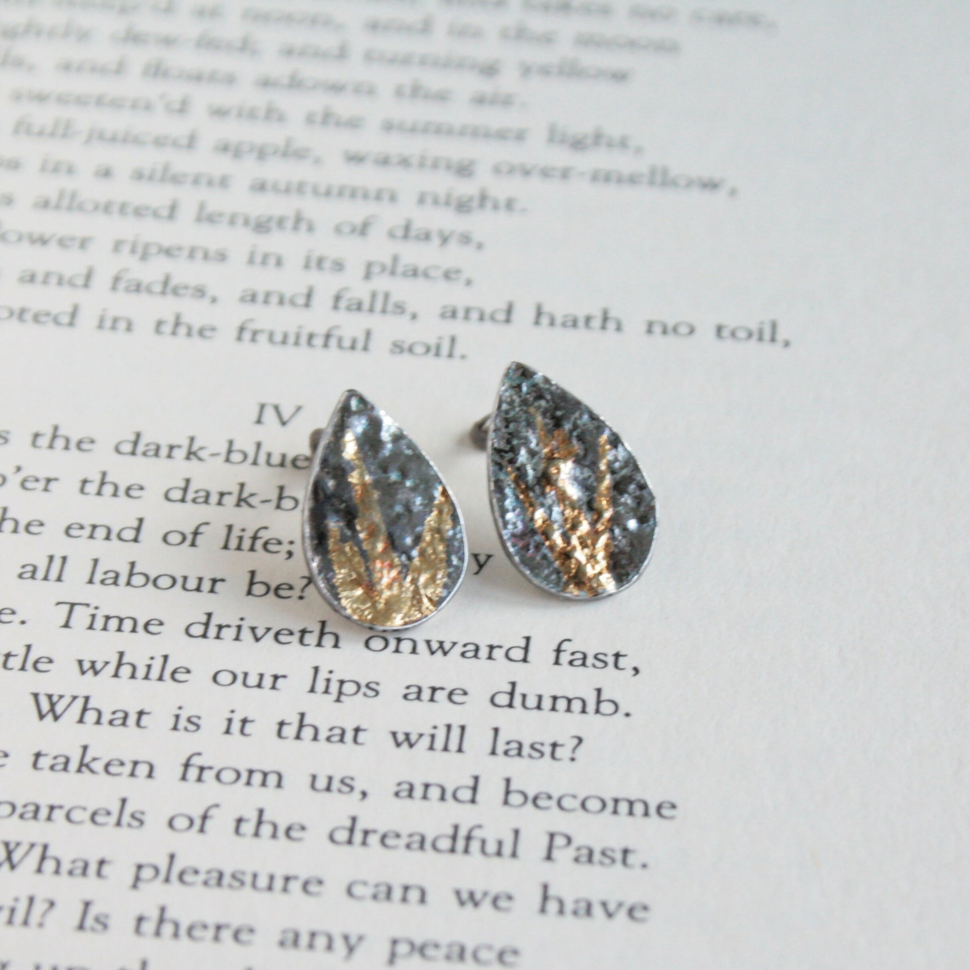 The earrings are a teardrop shape with a botanical pattern added to the surface with the 24 ct gold foil. I have applied a patina to darken the silver and provide a beautiful contrast against the gold. They are a stud fitting and have a length of 15mm.