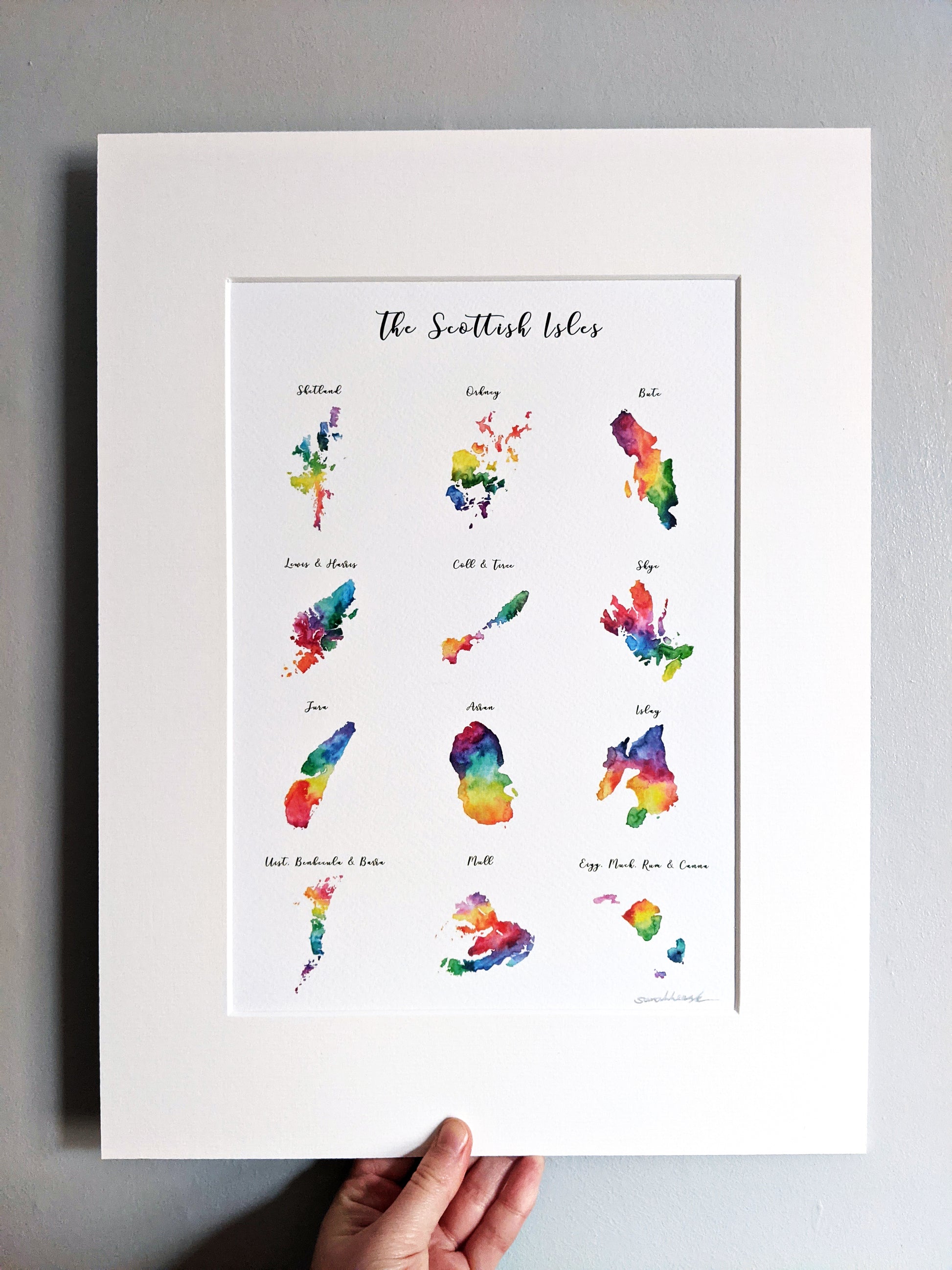 Sarah Leask is a Scottish illustrator & designer from The Shetland Isles. Established in 2017, Sarah Leask Studio grew from her love of colour, pattern and watercolour. She is known for her signature rainbow coloured watercolour maps, which feature many of the Scottish isles.